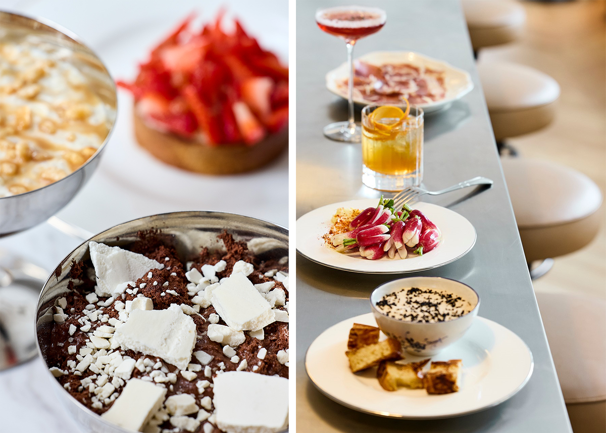 左:チョコレートムース、リ・オ・レなどクラシックなデザートを揃えている。 右:アペリティフはホームメイドのタラマ、ハム類の盛り合わせとともに。®narophoto