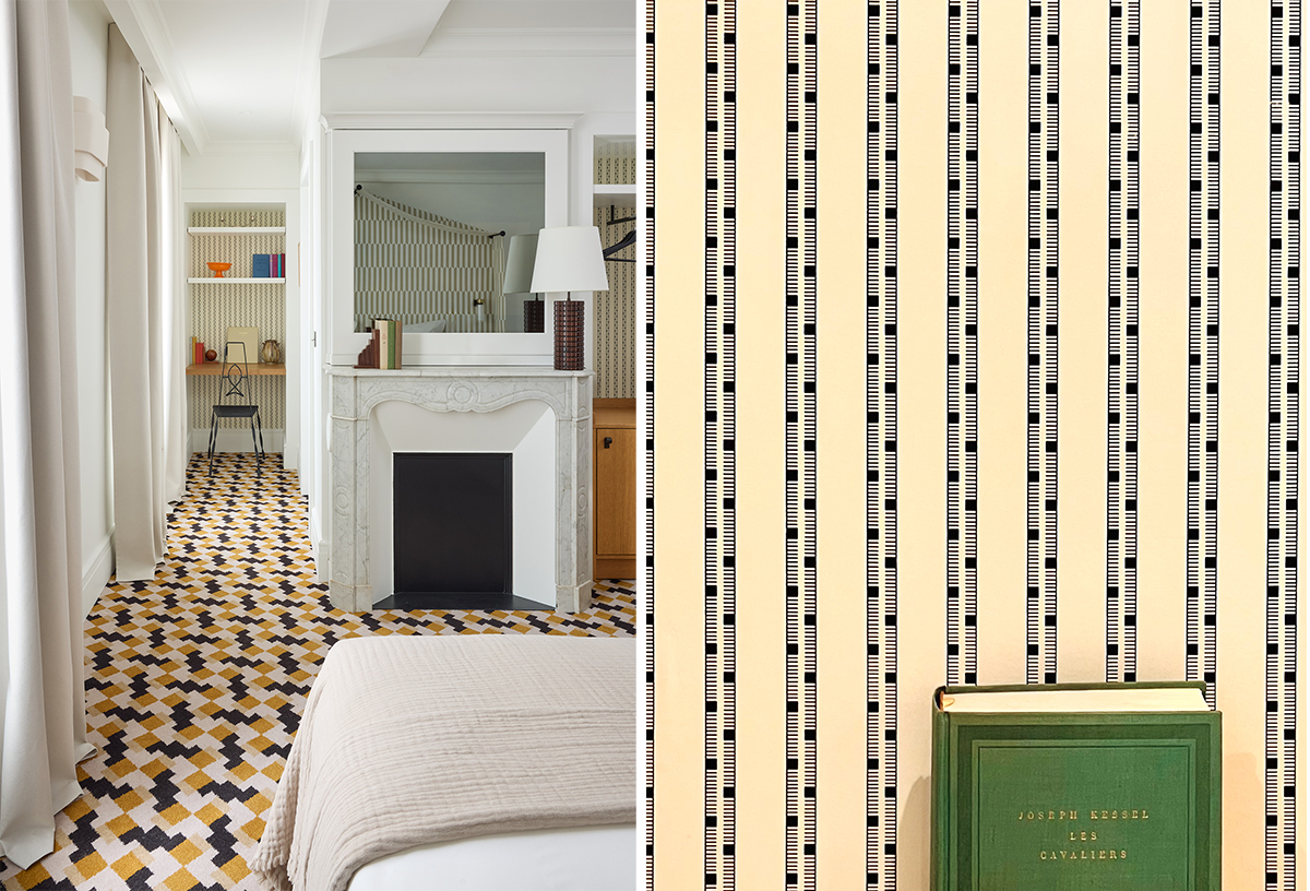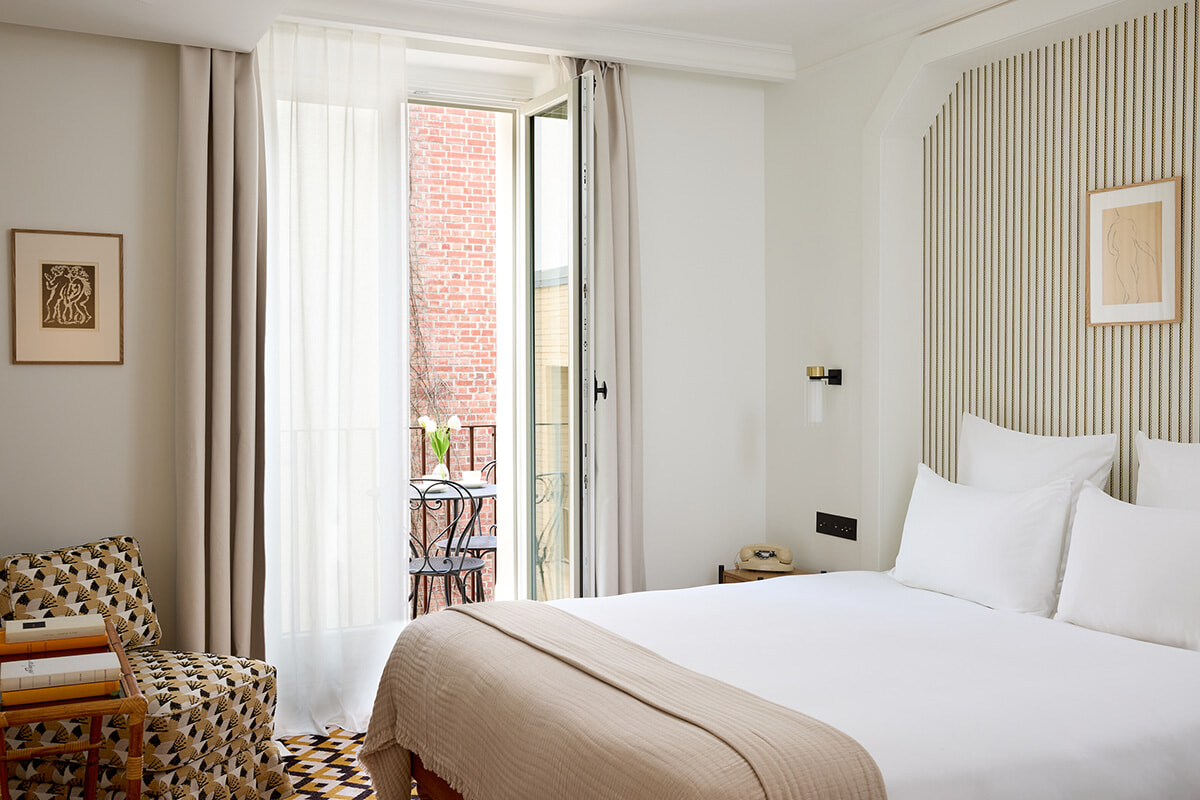 モダンタッチを混ぜ合わせたブルジョア・ボヘミアン調の客室の内装を手がけたのはジョルダンヌ・アリヴェッツ。グラフィックなモチーフのカーペットや壁紙、各部屋のベッドのヘッドボード、テントをイメージさせるベットのヘッドボード……綺麗な夢が見られそうと思わせるインテリアでどの部屋もまとめられている。なお客室に上がるエレベーターは動き出すと、まるでエッフェル塔を眺めながら上がってる錯覚が起きるようなビジュアルの仕掛けが面白い。ルーフトップに行くときも、この遊びを目で楽しめる。