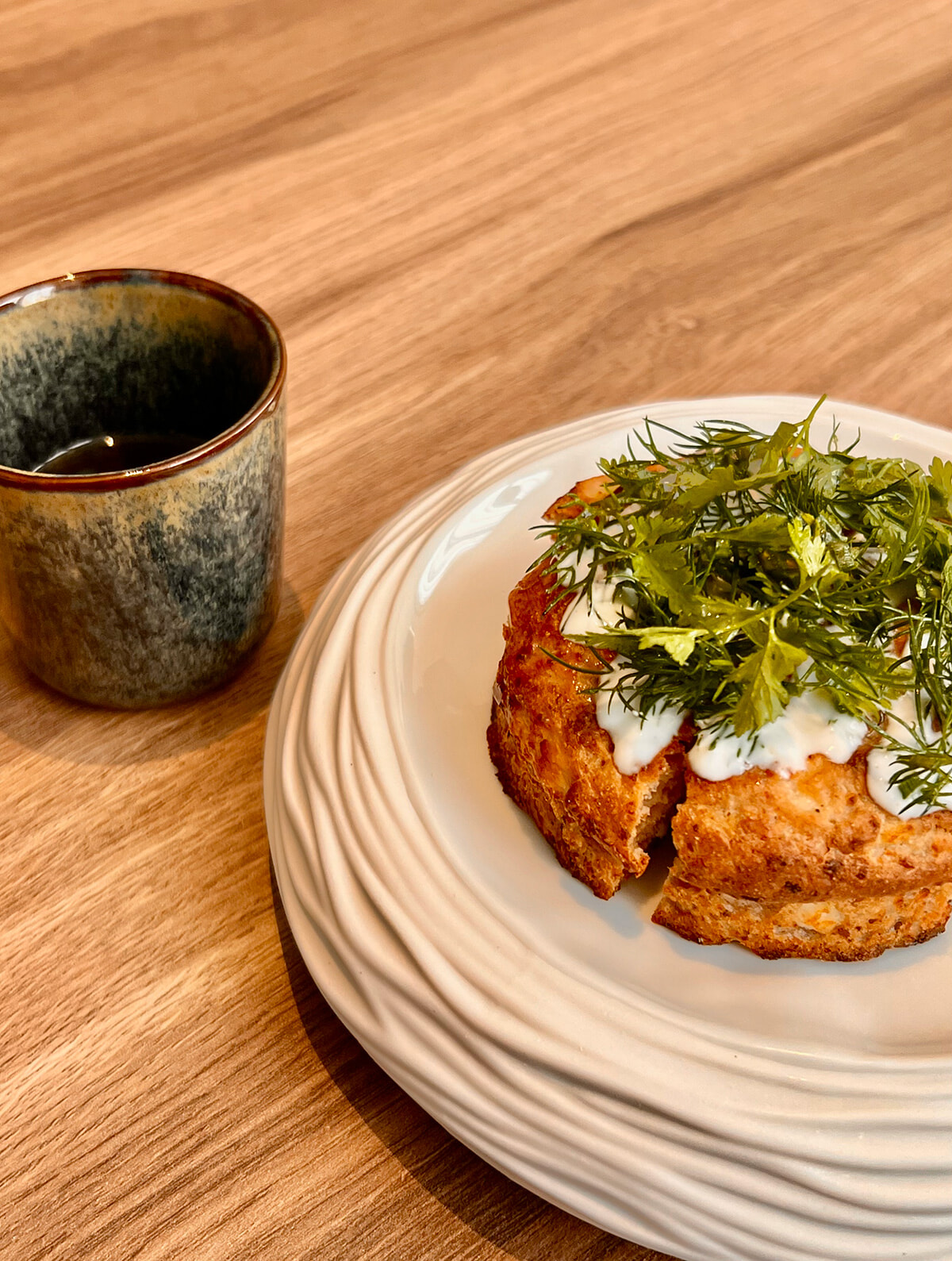 昔、シェフがバカンスを祖父母と過ごしたコルシカの思い出の味は栗粉のタルトのミリアチュウ。コルシカの名物チーズのブロッチュの味と最後にかける野生タイムのオイルが味のアクセントだ。これは手でいただく。同時にサービスされるマージョラムで煎じた野菜のブイヨン(左)は自然な甘みが優しい。photography: Mariko Omura