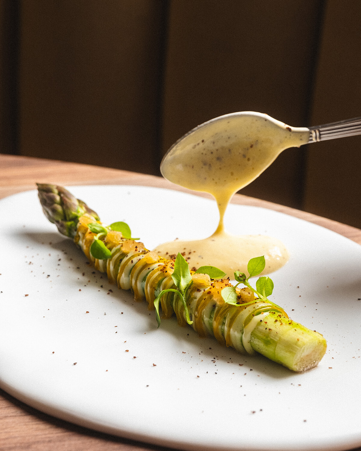 焼いたアスパラガスの香ばしさを柑橘類のマヨネーズが包み込む。添えられるサバイヨン・ソースはジン・トニックがインスピレーション源。ジンでおなじみのジュニエーヴルの香り、レモンやグレープフルーツの酸味がもたらされている。photography: Florian Domergue – Pausecom
