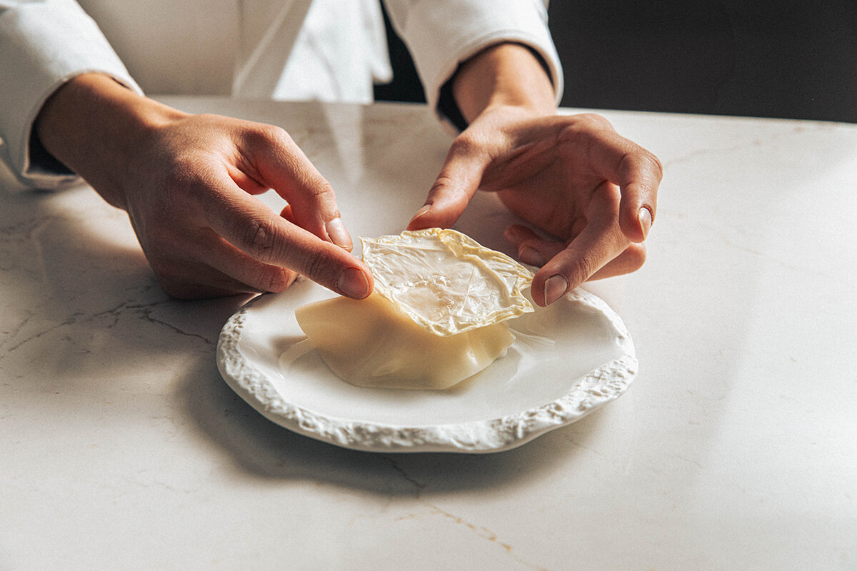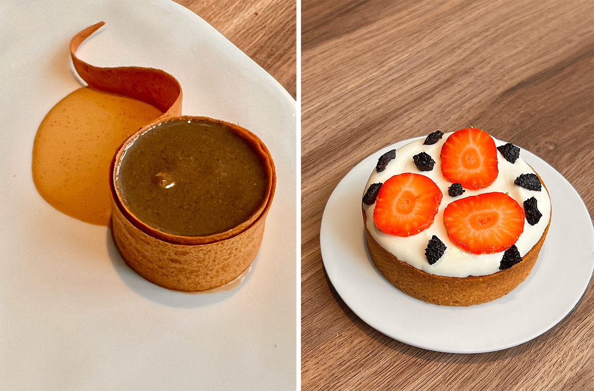 左:タンザニアとマダガスカルのバニラ、それに沖縄の白味噌というユニークな組み合わせの”バニラ・ミソ”。 右:オリーブで有名なニョンス出身のテッサが地元の黒オリーブとローズマリーを使った、シェアして食べるイチゴのタルトには、ローズマリーで煎じたオリーブオイルをかけて。これも手でいただく。photography: Mariko Omura