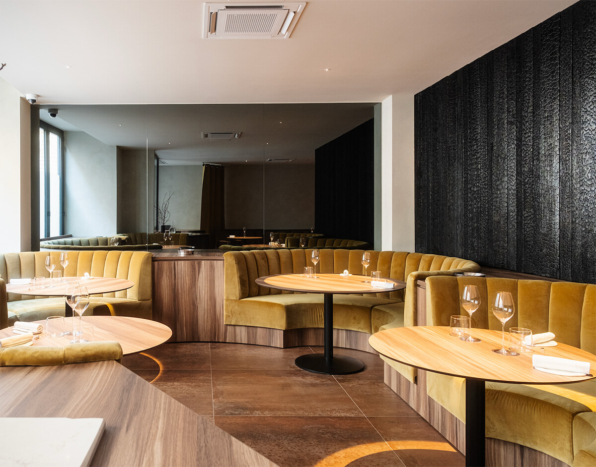 通りに面したスペース。右の壁にはシェフが一目で気に入ったという焼き杉が用いられている。photography: Florian Domergue – Pausecom