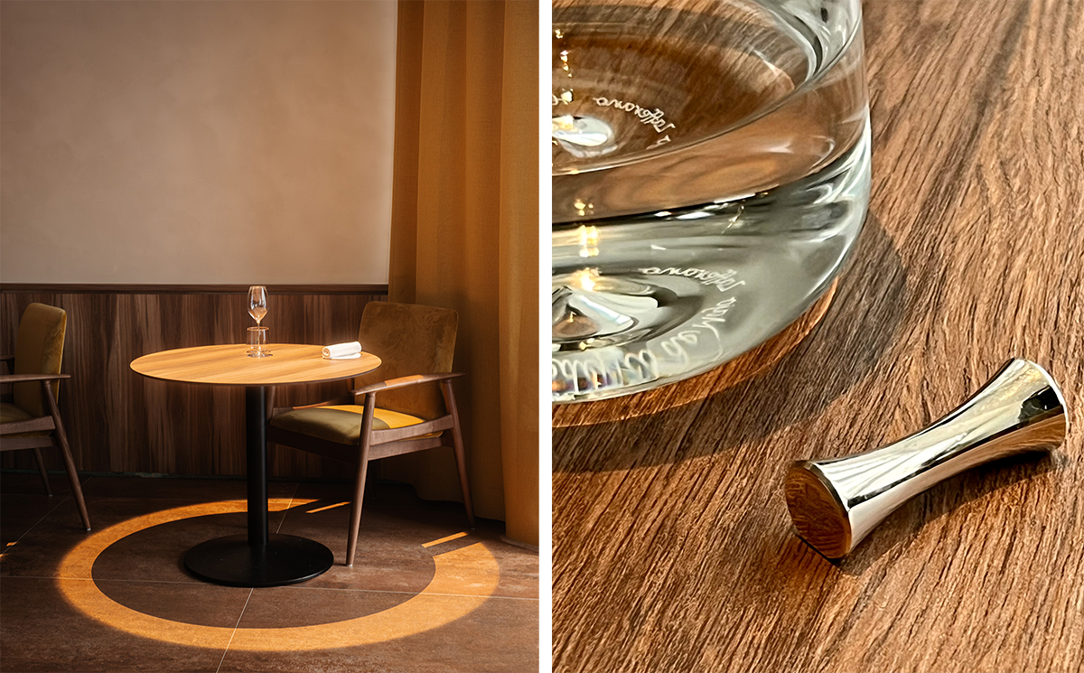 左:テーブルの真上のライトが作り出す光の遊び。 右:カトラリーレストはクリストフル、グラスはZalto, Riedel & Zafferanoというように、メニューにはコース名だけではなく、スタッフや関わった職人たちの名前やブランド名なども記されている。photography Florian Domergue – Pausecom