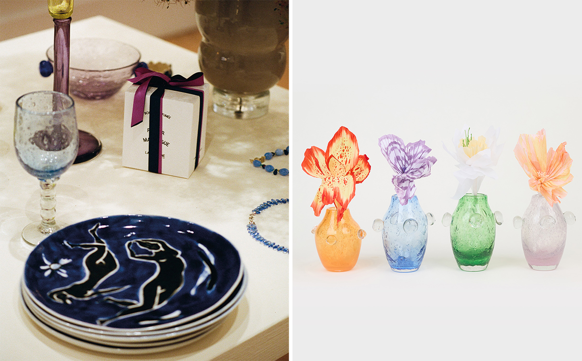 ブランドが扱うのはグラス、お皿、ナプキン、キャンドルスタンド、水差し……主にテーブルウェアだ。ポーリーヌ自身がデザインして職人に制作を依頼する品もあれば、彼女が気に入ったアーティストに声をかけて制作された品も。いずれにしても、日常生活に美しさとポエジーをもたらしてくれそうな他では見つからないオリジナルばかりだ。