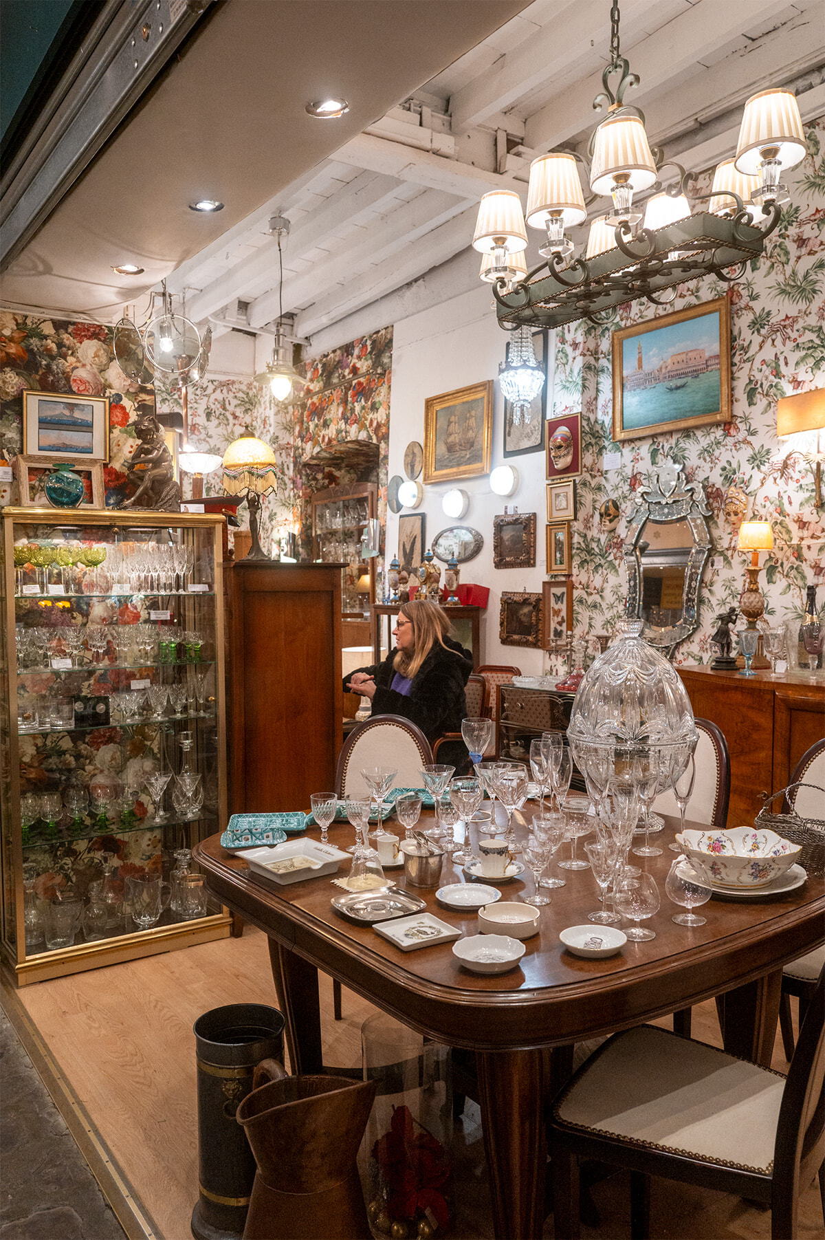 パッサージュ・デザンティケールのアーケードで、ひときわ大きなスペースで目を引くのがこの店。通路の左右に置かれた大きなテーブルには食器が無造作に重ねられ、ガラスの飾り棚にはアクセサリーやグラスがぎっしり。ブルジョア家庭の食卓を彩っていた19世紀のリモージュの食器一式、ヴァロリスのロベール・ピコによるエスカルゴ皿、バカラのワイングラス、17世紀のクリスタル製の呼び鈴など、お宝が次から次へと顔を出す。フランスのアールドゥヴィーヴルを代表する、由緒正しいテーブルウェアが見つかる。