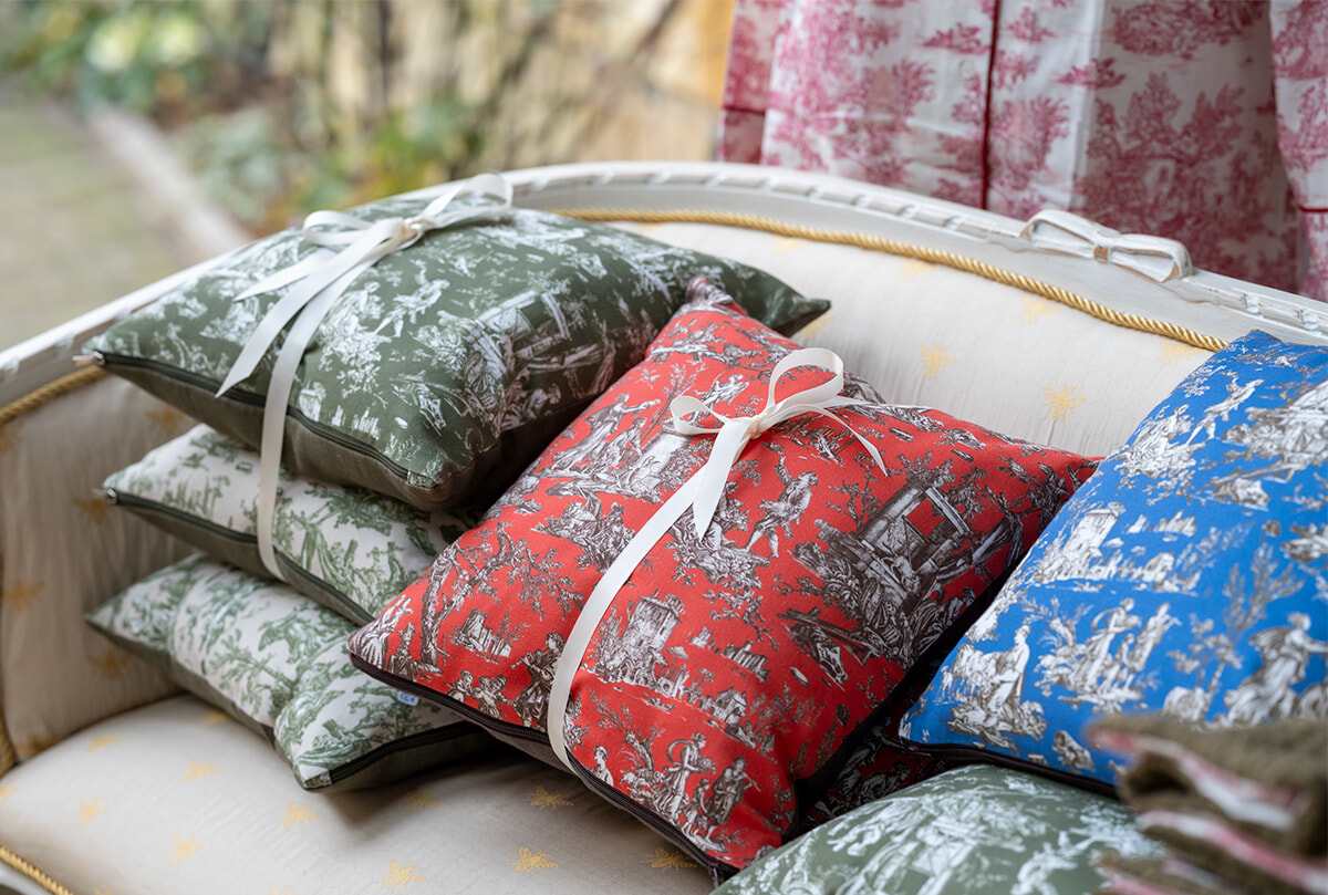 トワル・ドゥ・ジュイのオリジナル雑貨は人気が高い。クッションカバー各54ユーロ