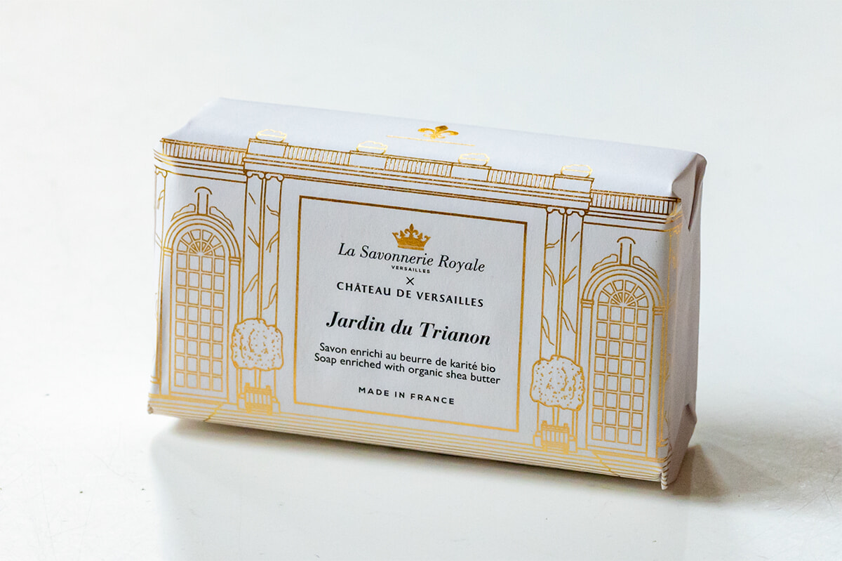 シャトーとのコラボから生まれたオリジナルソープ「トリアノンの庭」は、宮廷で愛されたチュベローズの香り。11.50ユーロ