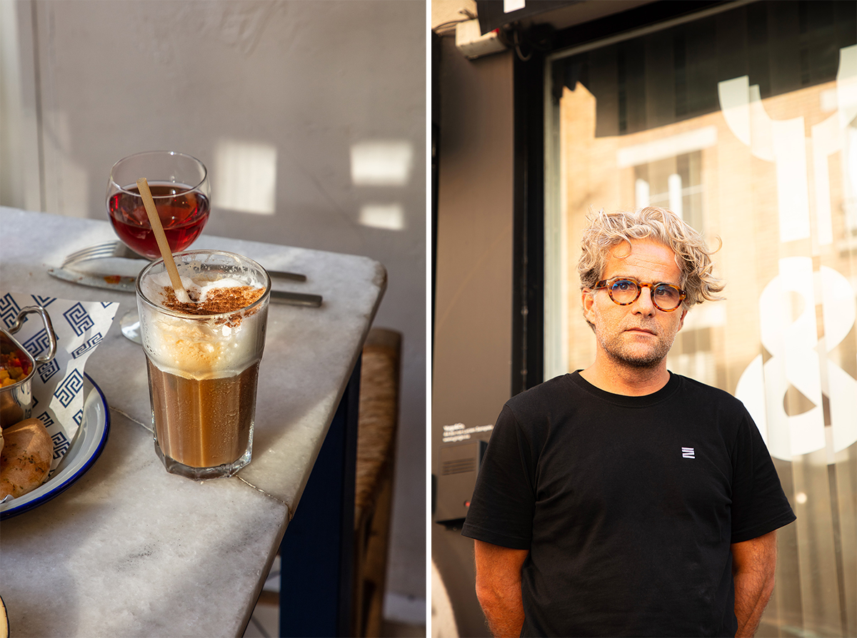 左:カフェ・フラッペ。氷とミルクとシュガーをたっぷり入れて! 右:ヨルゴ・トルパス。フランス版ヴァニティ・フェアやGQ Franceといった雑誌のクリエイティブディレクーも務めた。photography: 右 Emmanuelle Lubaki