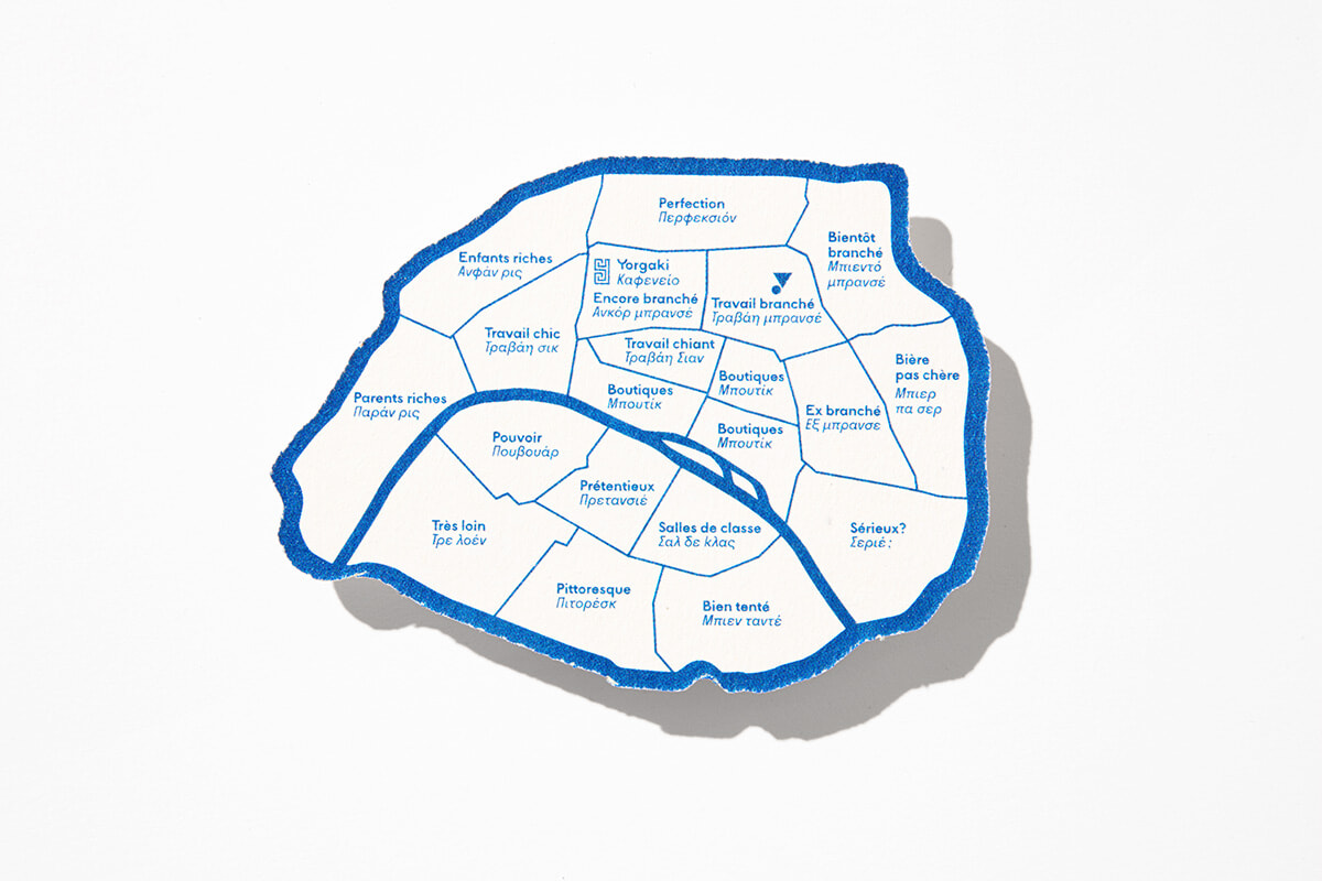 店のある9区は”いまでもブランシェ”、7区は”チップ”、20区は”ビールが安い”といったヨルゴの解釈によるパリ地図。コースターは5ユーロ(写真/10枚入り)。photography: Emmanuelle Lubaki ©Yorgo&co