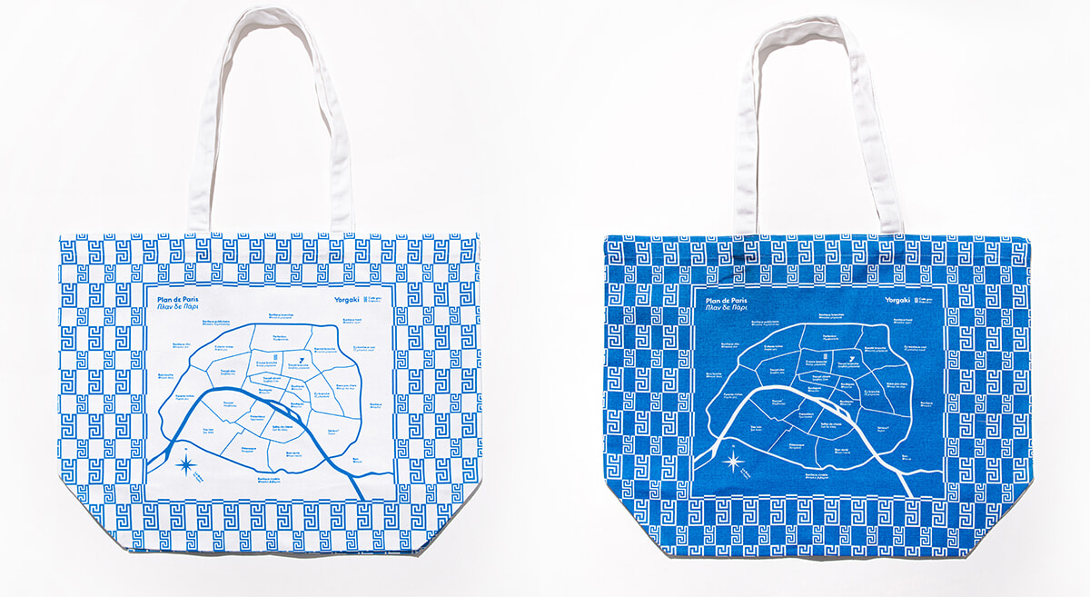 現在デパートのボン・マルシェで開催されているバカンス気分満載のフェア「Tout Beau et Tout Bronzé(すっかり小麦色、非常に美しい)」展の一環として、食料品館のラ・グランド・エピスリーでヨルガキのポップアップが7月2日まで開催されている。トートバッグやナプキンに描かれたブルーのモチーフはギリシャ的パリ地図。ギリシャのカフェやレストランではテーブルクロスよりも厚手の紙のテーブルカバーが一般的で、その多くはギリシャやその土地の地図が描かれたものである。それを模して、ヨルゴは得意の技でパリの地図をデザインしたのだ。パリの区ごとにユーモアな名称が付けられていて、パリっ子を楽しませている。
