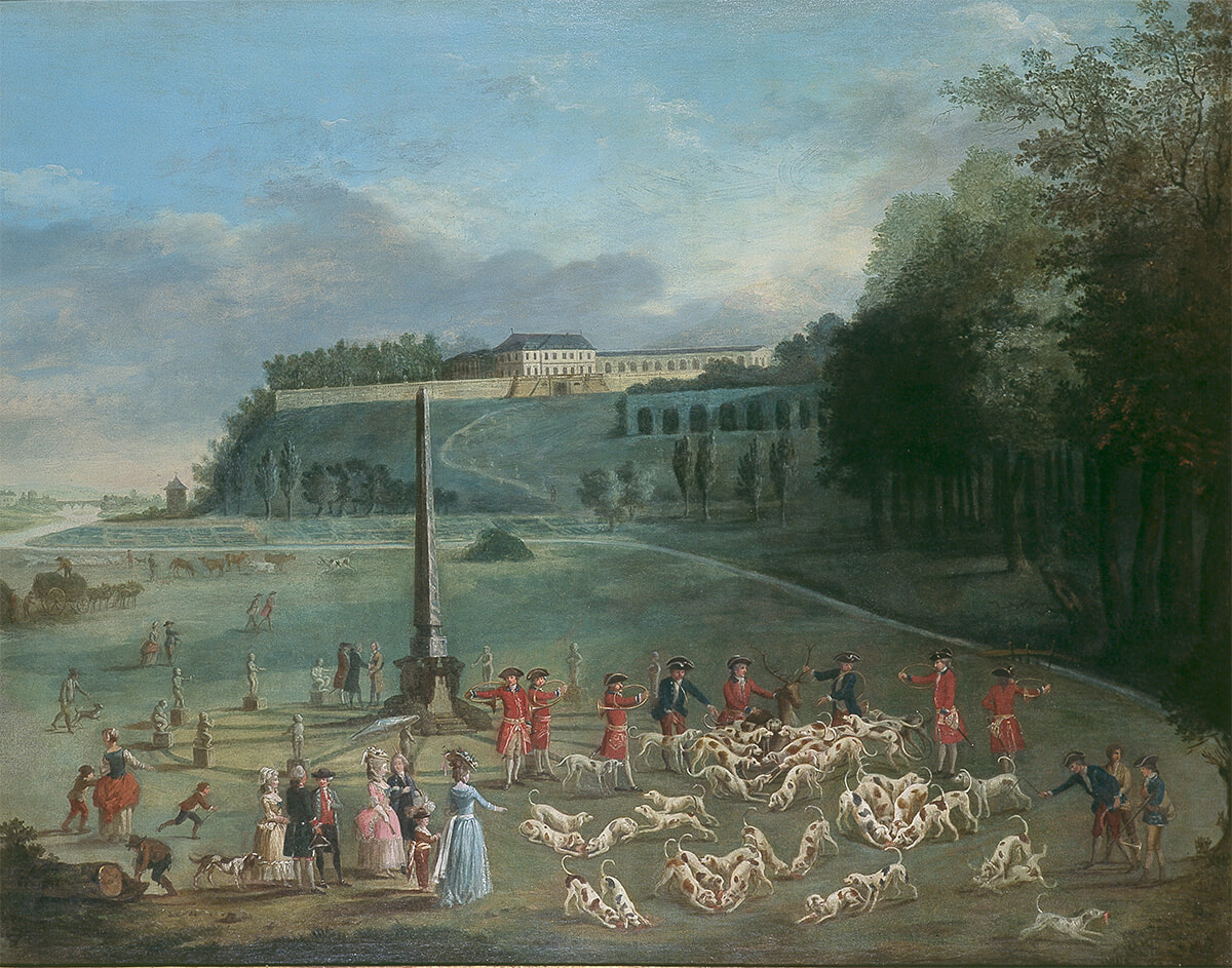 パリ近郊のサン・クルー城で小規模な狩猟を楽しむルイ14世の弟オルレアン公を描いたJacques Bertaux作『Partie de chasse du duc d’Orléans au château de Saint-Cloud』(1778年/Musée du Domaine départemental de Sceaux所蔵)。