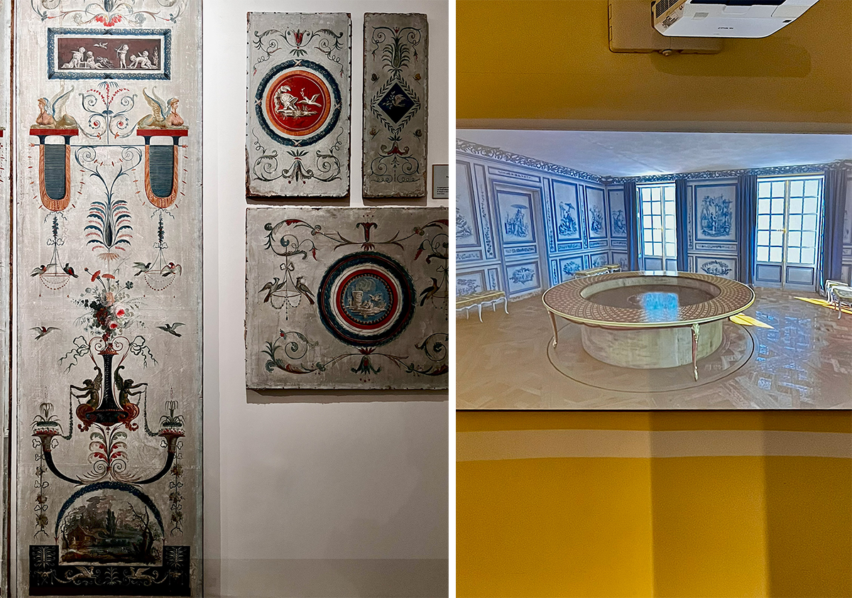 左:室内装飾のコーナー。 右:3D復元の映像でサンジェルマン=アン=レのノアイユ邸、ショワジー城の1770年ごろの様子が紹介されている。Agence Aristeasによる復元で、ショワジー城の有名な”空飛ぶ食卓”(写真)がどう機能していたかを発見できる。photography: Mariko Omura