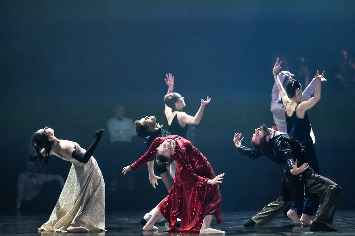 20時開幕。劇場内が暗転し、舞台には真っ赤なカーテンが。その色がくすみ、そしてモノクロへと変化してゆく。シェクターがプログラムに寄せたテキストのタイトルは「グラムールとグロテスクの間で」とあり、”グラムール(うっとりさせる魅力)というのは、その中に何があるのか覗きたくなる封筒やカバーのようなもの”と語っている。そしてタイムラインの項目を読むと、”紀元前458年に書かれたギリシャ悲劇、アイスキュロスの『アガメムノーン』において赤い絨毯は悲劇の重要な要素として使われていた”と記載されている。踊るダンサーは13名。『レッド・カーペット』といっても、このバレエは映画祭で繰り広げられる華麗な雰囲気ばかりというわけではないことが、こうしたことから察せられるだろう。