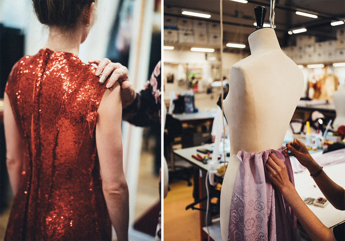 左:鮮やかな赤のスパンコール・ロングドレス。キャロリーヌ・オスモンの激しい踊りにも体に寄り添う見事な作りだ。 右:カメリアの浮き彫りモチーフの布で。©Chanel