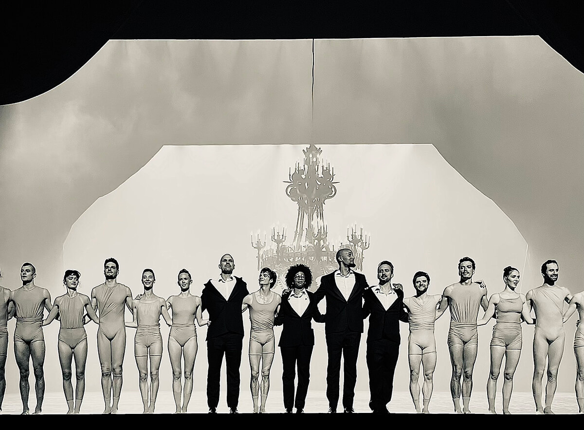 さてタイトルはレッドカーペットだけれど、作品60分を通して舞台装置として活躍するのはカーテン(幕)だ。半開きし、閉じ、上がり、下がり、とステージのディメンションに変化をつけ、この幕の動きに合わせて天井から吊り下げられた巨大なシャンデリアが上下して……。そんな空間にシーンごとの雰囲気を作り上げているのが照明である。担当したのはトム・ヴィッサー。彼はパリ・オペラ座ではアレクサンダー・エクマンの『Play』、クリスタル・パイトの『The Seasons’ Canon』『Body and Soul』でも照明を手がけているので、ガルニエのステージを熟知している。上からの強い照明が遮断幕の役を果たし音楽家たちの存在を消したり、放射状の光でミラーボールがあるような錯覚を起こさせたり、教会にいるような薄暗い光がステージ上を移ろい、スモークが焚かれたように空間全体をぼやけた光で包めば、踊るダンサーたちのモノクロームのシルエットが浮かび上がるのだ。照明が変わるごとに目の前で繰り広げられる光景の中で踊るグループの姿はどれも力強く美しく、なんとなく映画を見ているような気にもなる。