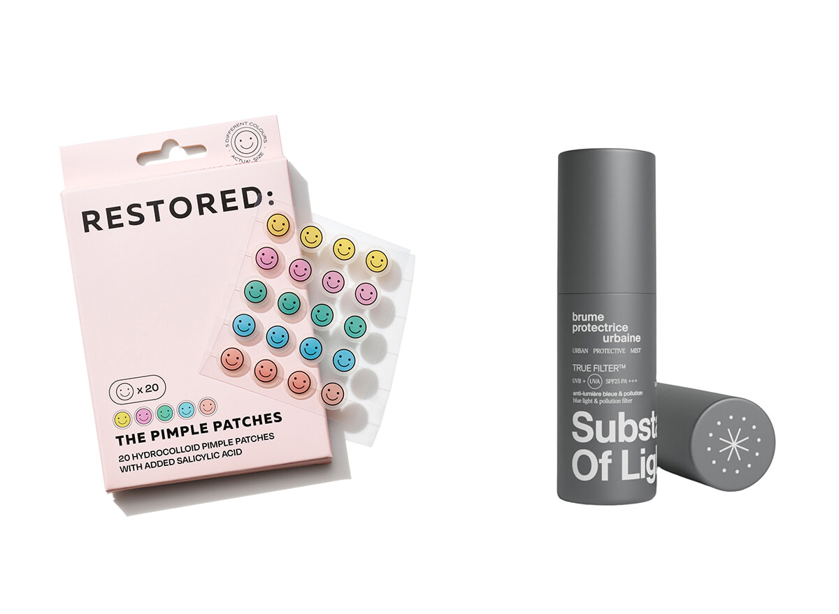 左:英国からRestored。ニキビパッチは10ユーロ(20パッチ入り)。 右:Substance of Lightのアーバンミスト、39ユーロ(50ml)