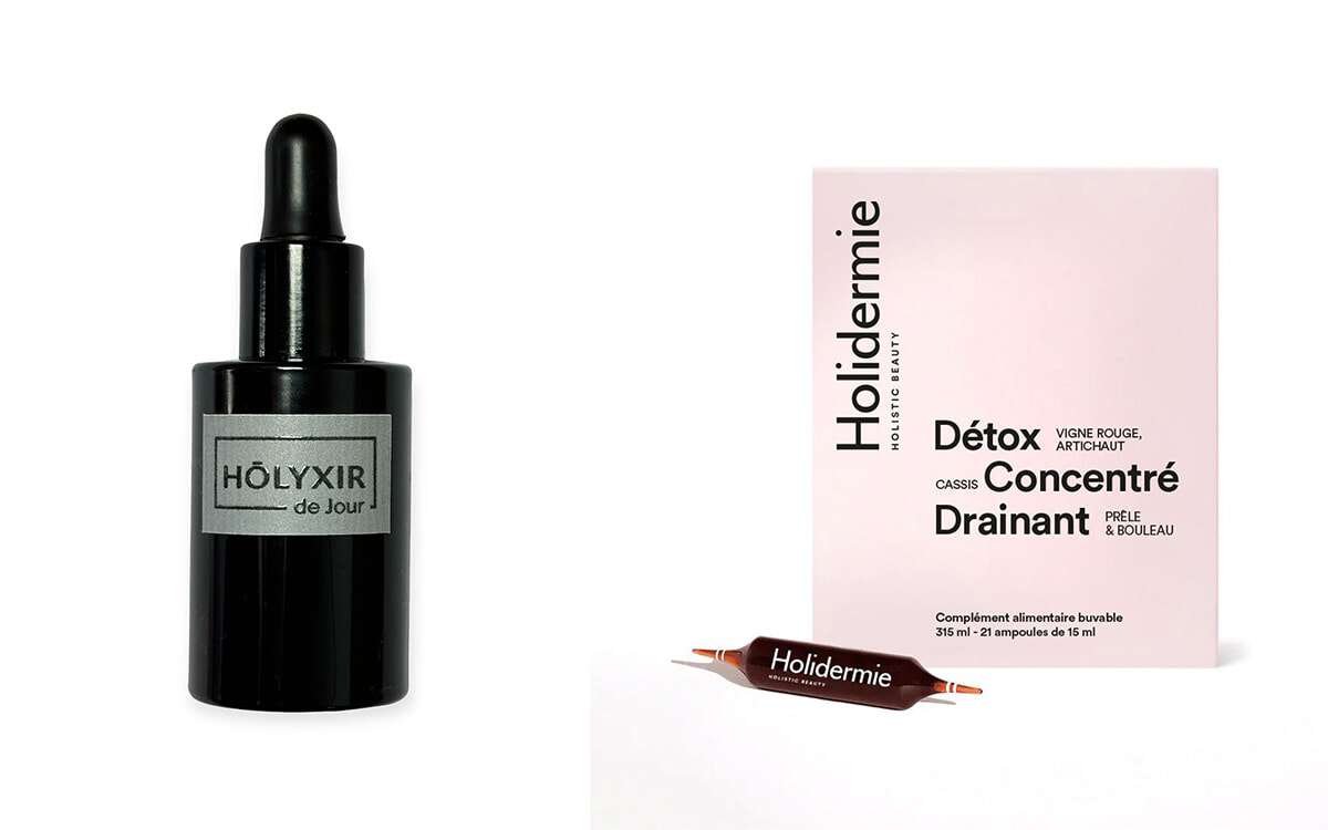 左:クリームの代わりに5滴のアンチエイジ・エリクシールを!と提案するフランスの新ブランドHolixir。昼用、夜用があり各59ユーロ(30ml)。 右:ホリスティックビューティーをうたうパリジェンヌ御用達ブランドHolidermie。体を浄化し、排水し、軽快に。39ユーロ(アンプル21本)