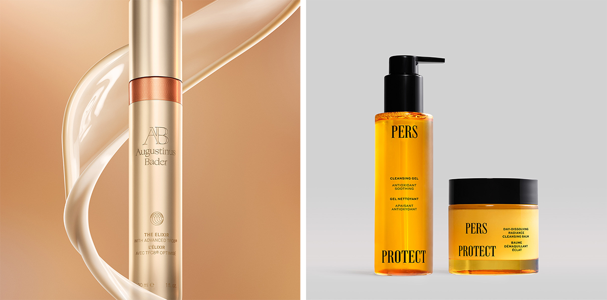 左:Augustinus Baderのフィトペプチド配合のThe Elixir(490ユーロ)。 右:Persのクレンジングジェル(左 40ユーロ)とクレンジングバーム(50ユーロ)。