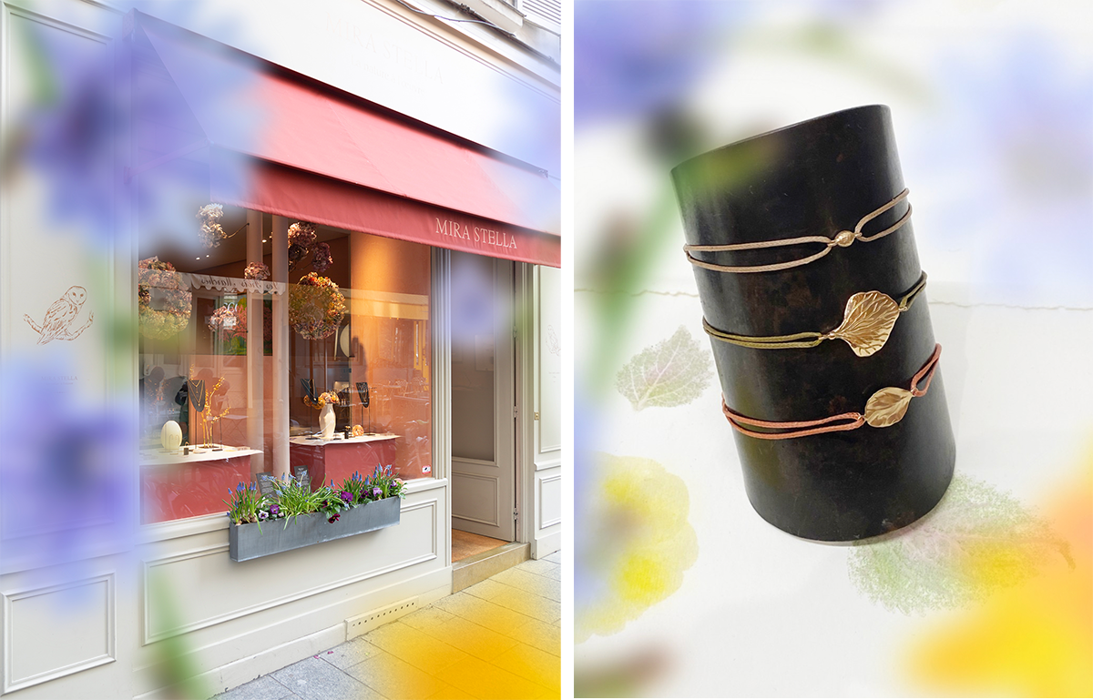 左:サンジェルマン市場のすぐ近くにあるMira Stellaのブティック。 右:人気のコードブレスレット。