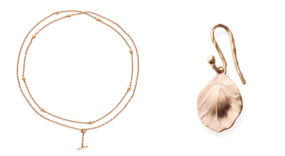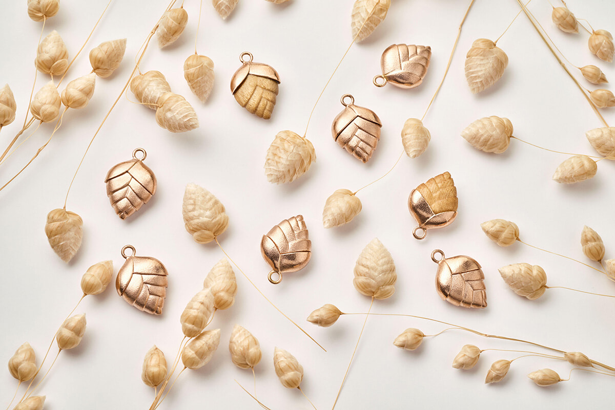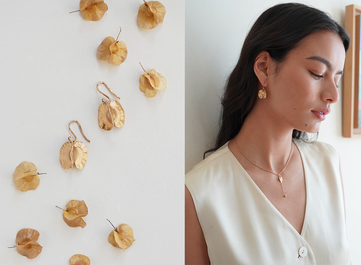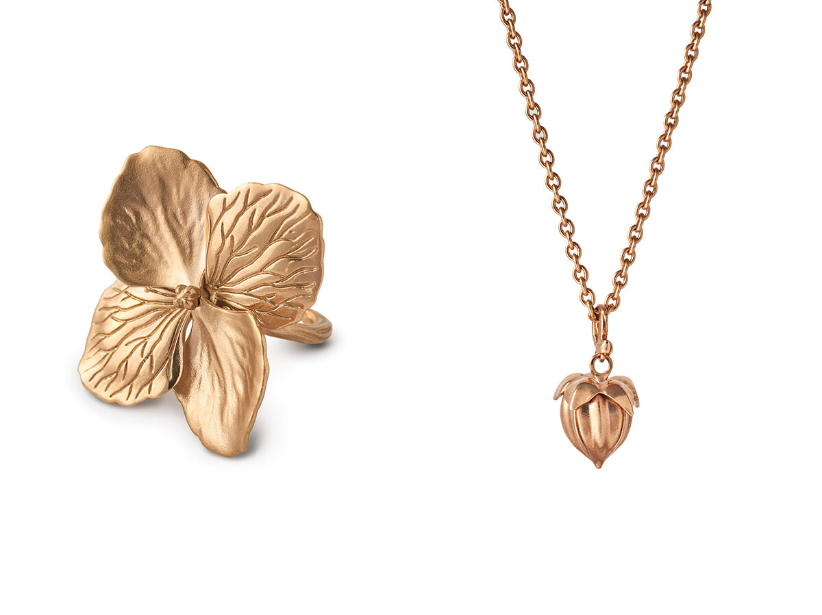 左:ソフィーが最初にジュエリーにした植物は、8700万年の歴史を持つあじさい。バリエーションはリング、その他花弁1枚のペンダントトップ、ピアス、ネックレスなど。 右:亜麻のさやのペンダント。木とゴールドの組み合わせタイプもある。