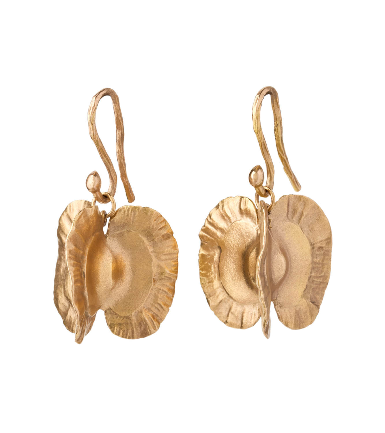6月、新作が発表された。6500万年前からこの世に存在する植物に属し、200万年の歴史を持つハウチワノキ(Dodonaea viscosa)の立体的なイヤリングである。原産地はオーストラリアの植物だけれど長い歴史の中で風に運ばれ……。ある時、ご主人が中近東から持ち帰ったその種をノルマンディーの庭に撒いたところ、うまく育ったそうだ。このことから旅への賛歌として、彼女はハウチワノキの種を包む薄く繊細なさやのフォルムのジュエリーをクリエイトした。このさやは軽くて、ふっくらと立体的。それが空高くプロペラのように舞って、風に乗って遠方へと運ばれてゆくのである。