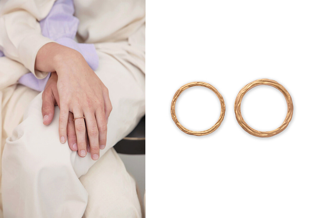 さてこの新作と同時に、オークの樹皮がモチーフのリングに幅の広いタイプが生まれ、メンズ用サイズも登場した。こちらも18カラットのピンクゴールドである。これでミラ・ステラでエンゲエージメント・リングを見つけることができるようになったのだ。