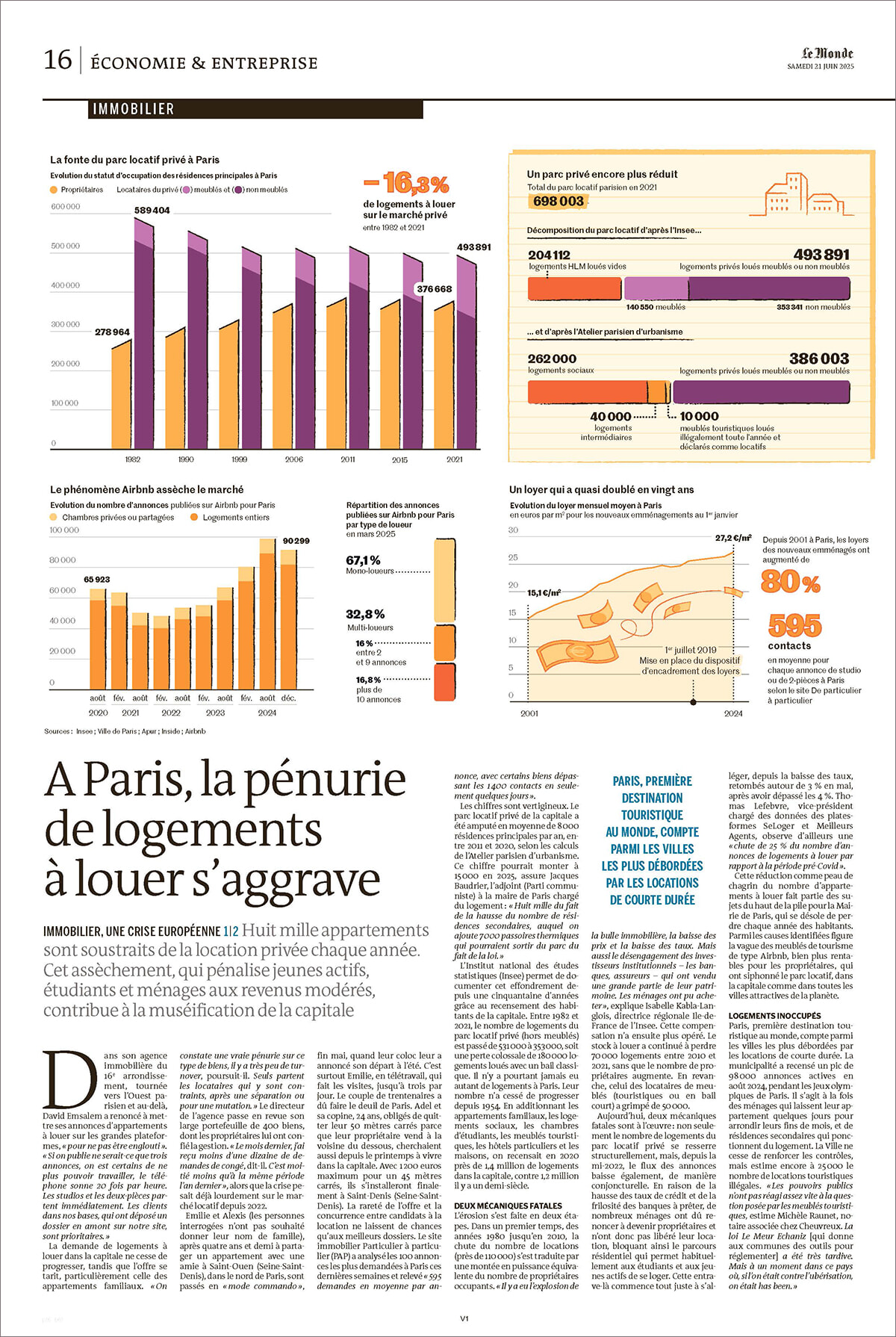 「ル・モンド」紙2025年6月20日付の記事では賃貸住宅危機を2ページにわたって分析。1950年代からの人口と物件数の推移をさまざまな角度で示す図解から、その深刻さがひと目でわかる。photography: ©Le Monde