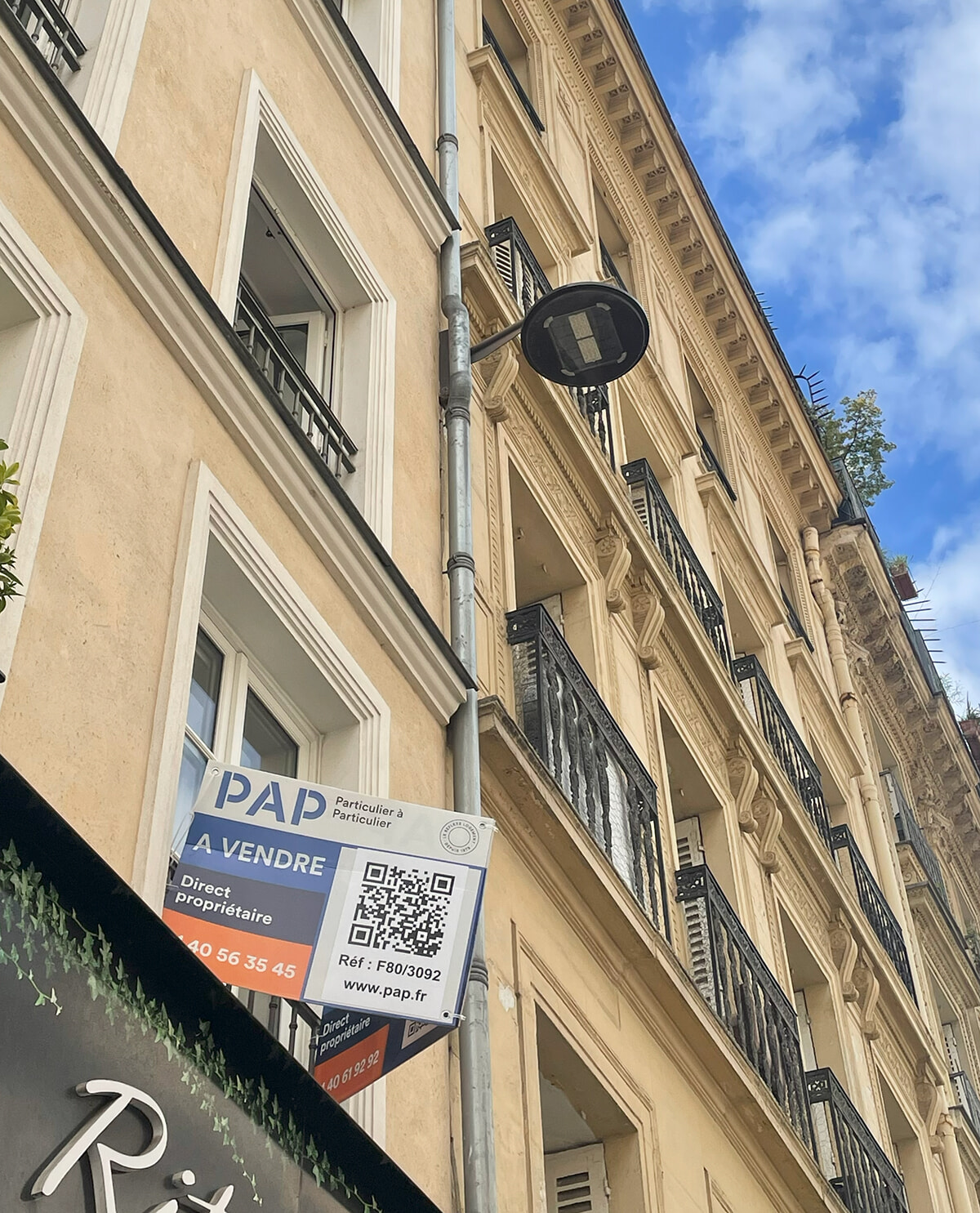 パリの通りでは「A louer(貸します)」や、写真のように「A vendre(売ります)」といった看板が窓辺に掲げられるのが一般的。しかし7月、「貸します」という看板はまったく見つからなかった。