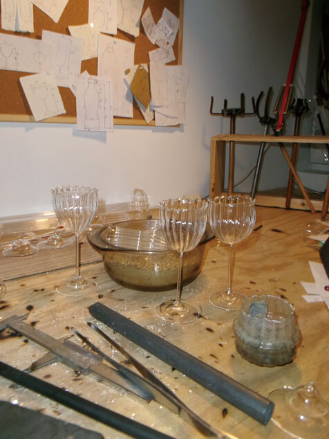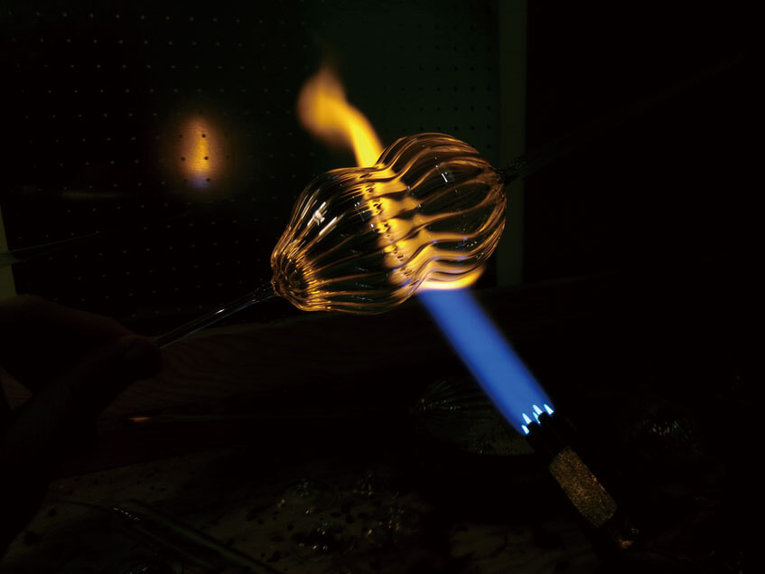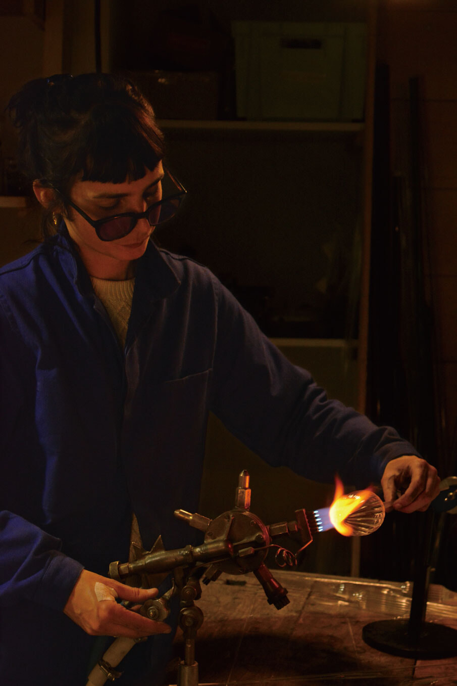 アトリエで作業するマルゴ。手で回転させながらバーナーで熱を加えてグラスを成形してゆく。