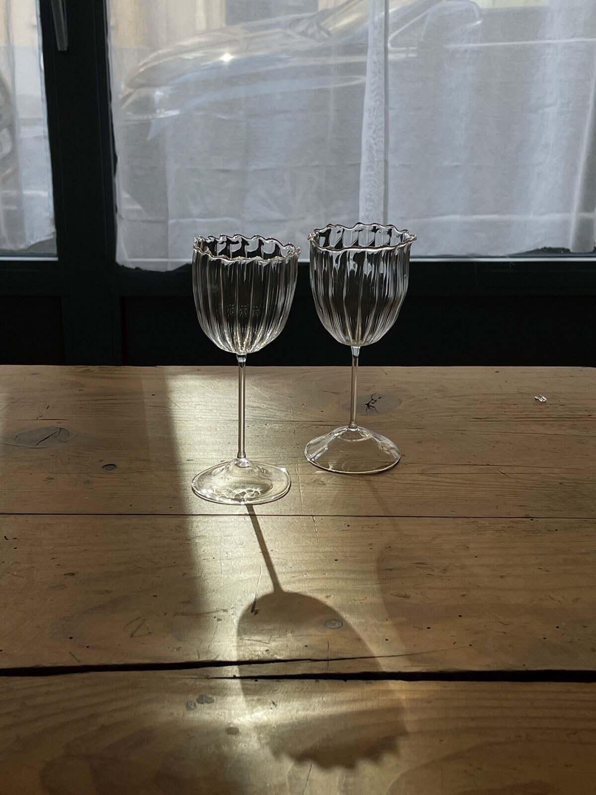 繊細な脚付きグラスは彼女の代表作。波打つ縁の表情やスタンドの形が微妙に違う。「Tulipe」各65ユーロ