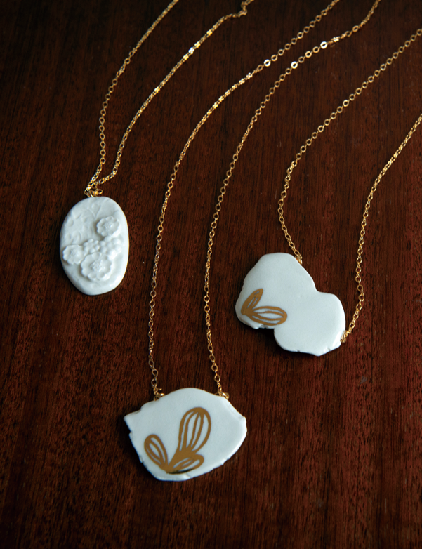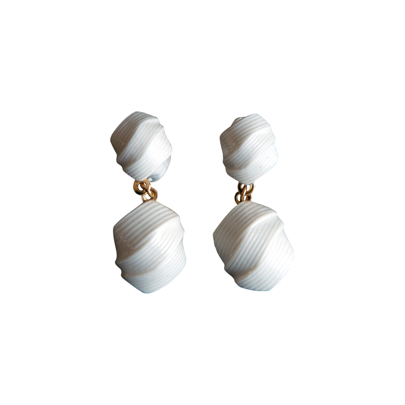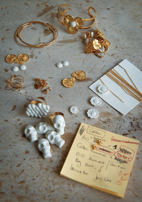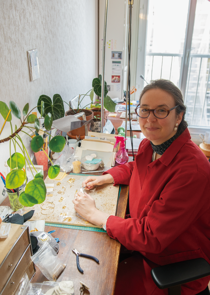 出版社勤務を経てアーティストに転身したヨレーヌ・ジレ。「ジュエリーが好きでずっと集めていた」彼女が、自分で制作を始めたのは自然なことだった。素材にセラミックを選んだのは白いジュエリーが欲しかったから。バラの花やスカル、あるいは抽象的なフォルムを象った白い小さなピースと、パリの職人の手で作られるゴールドメッキのメタルパーツを組み合わせた繊細なジュエリーが彼女のスタイルだ。インスピレーションはコレクションしてきた古いジュエリーや、ボタンやオブジェの縁のモチーフなどから。白にゴールドの線画を描いた金継ぎを思わせるピースや小花を散らしたペンダントヘッドなど一点モノ、ウェディング向きのオーダーメイドも提案している。