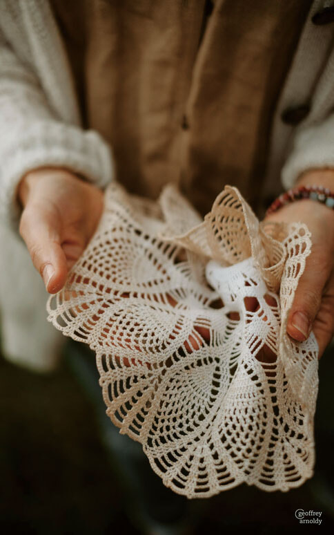 作品はヴィンテージレースのナプキンから生まれる。