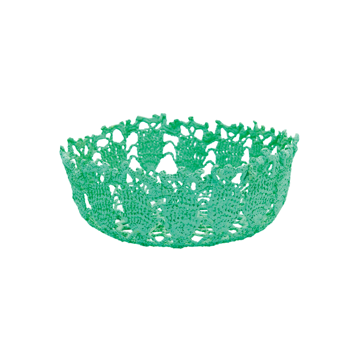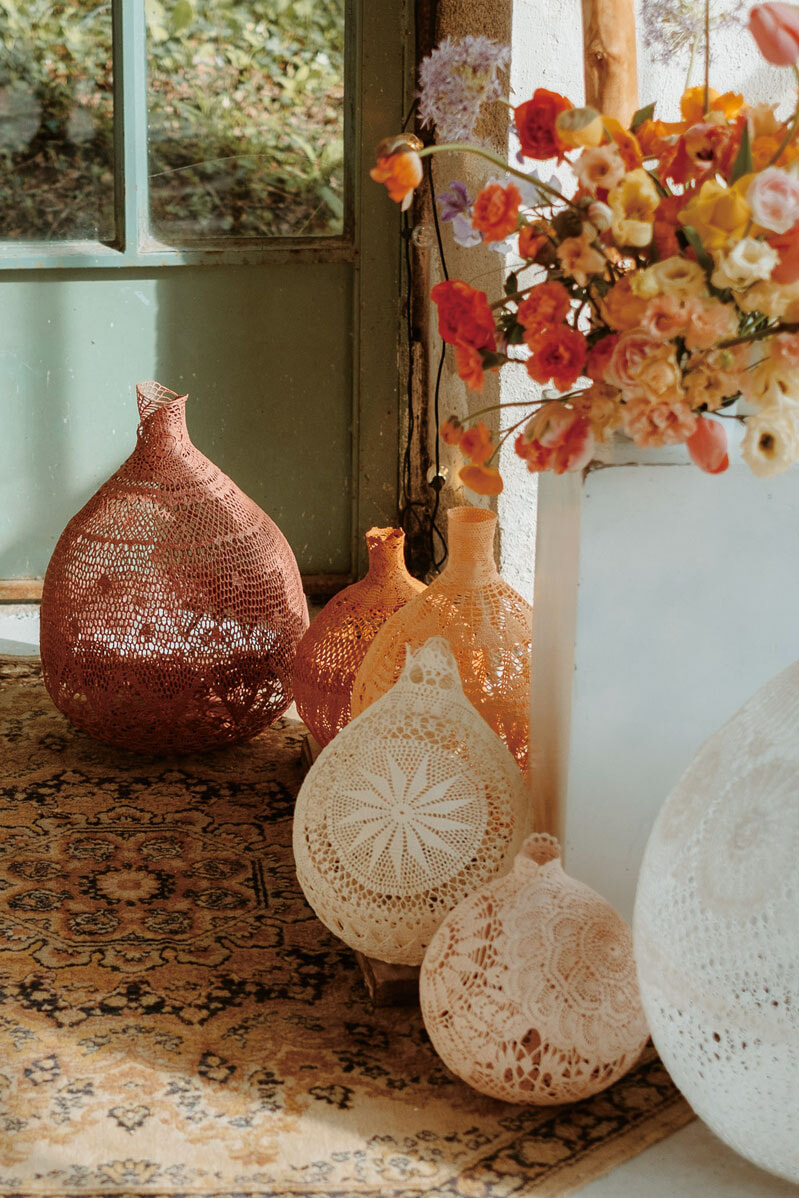 テキスタイルデザイナーだったヴェロニク・ダマールが自分自身のプロジェクトを立ち上げたのは2011年のこと。祖母が趣味で作っていたレース編みのナプキンを糊付けの手法でボウル形に成形し、結婚式や洗礼式用に提案したのが始まりだった。古臭いイメージを吹き飛ばすために色のバリエーションを提案し、いまではオブジェや照明にも作品の幅を広げている。風船を組み合わせるなどして型をクリエイトし、レースに多種多様なフォルムを与えていく。「女性たちの手仕事に敬意を表したい」と語り、素材はいずれもヴィンテージレース。それぞれのモチーフにインスパイアされる作品はどれも一点モノだ。イベントやショップのデコレーションを依頼されることも多い。