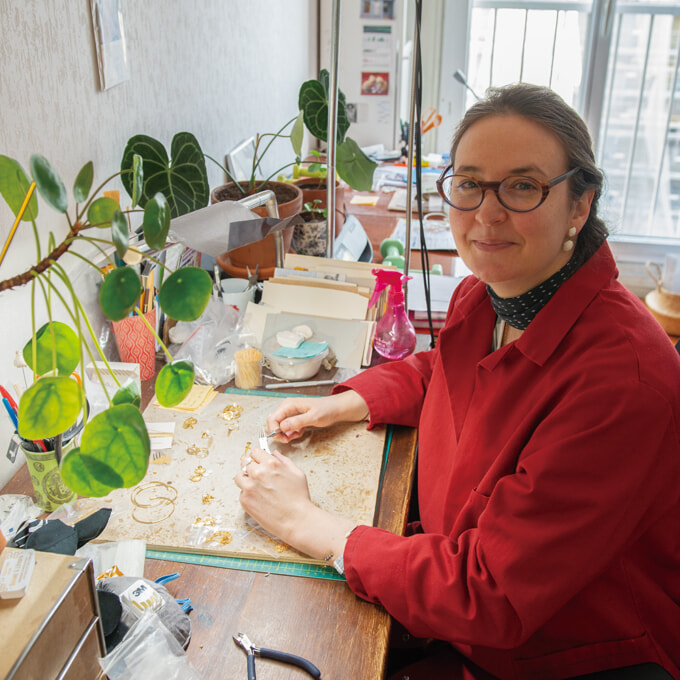 出版社勤務を経てアーティストに転身したヨレーヌ・ジレ。「ジュエリーが好きでずっと集めていた」彼女が、自分で制作を始めたのは自然なことだった。素材にセラミックを選んだのは白いジュエリーが欲しかったから。バラの花やスカル、あるいは抽象的なフォルムを象った白い小さなピースと、パリの職人の手で作られるゴールドメッキのメタルパーツを組み合わせた繊細なジュエリーが彼女のスタイルだ。>>See More