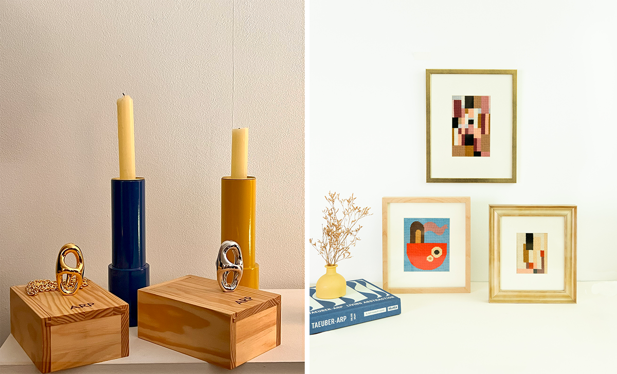 左:後方はこの家のためにゾフィーがデザインしたキャンドルスタンドのリプロ。手前の展示はセリーヌのアルプ・プロジェクトのペンダント(左:ヴェルメイユ/5000ユーロ、右:シルヴァー/4500ユーロ)。エディー・スリマンが2024年のアーティスト・ジュエリー・プログラムに選んだのはアルプの「プトレマイオスII」(1958年)。photography: Mariko Omura 右:Unwind Studioによるクロスステッチ・キット3種。Photo & droits: Unwind Studio