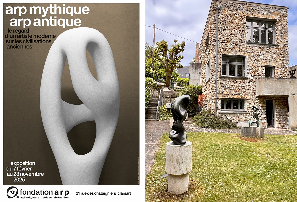 左:11月23日まで開催の展覧会『arp mythique arp antique』のポスター。 右:パリ郊外、クラマールに立つジャン・アルプとゾフィー・トイバー=アルプが暮らし、クリエイションに勤しんだ建物。photography: Mariko Omura