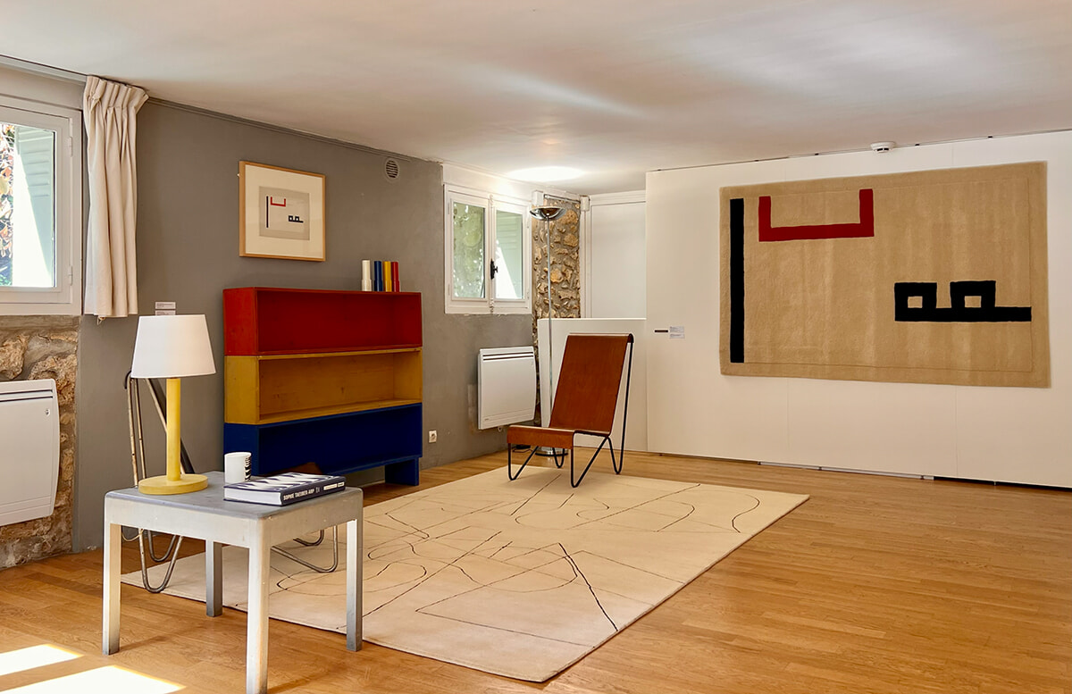 2階と3階で展開されている展覧会はジャン・アルプの作品についてで、ゾフィーの仕事がフォーカスされているのは地上階だ。財団が所有するゾフィーによるグアッシュL’Aubetteの作品のひとつが、最近ウールでラグに再現された。これはクリストファー・ファー・ロンドンとのコラボレーションによるものだ。また、彼女がこの家のためにデザインした燭台のIC Designによるリプロ、そしてゾフィーのデッサンと刺繍から生まれたクロスステッチ・キットなどもこのフロアで発見できる。敷地内の別館の1階にブティックがあるので、どんな品が入手できるかチェックしてみるといいだろう。