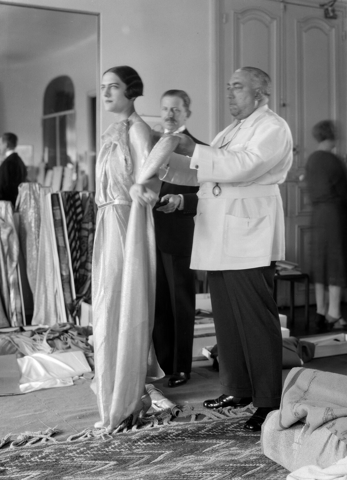 ロン・ポワン・デ・シャンゼリゼ1番地に構えたクチュールメゾン内でフィッテイング中のポールポワレ。1927年。