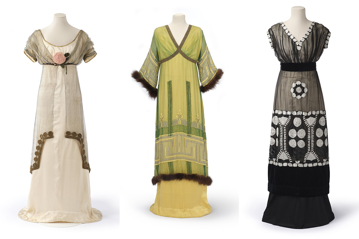 ポール・ポワレの名前に思い浮かぶシルエットのドレス。左は1907年のソワレ「Joséphine」、中は1908年ごろのソワレ「Mosaïque」、右は1910年のソワレ。©Les Arts Décoratifs / Christophe Dellière