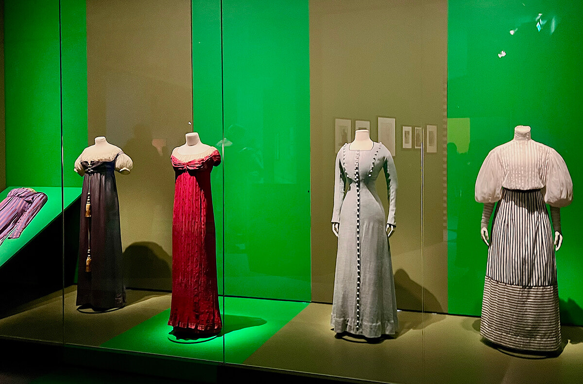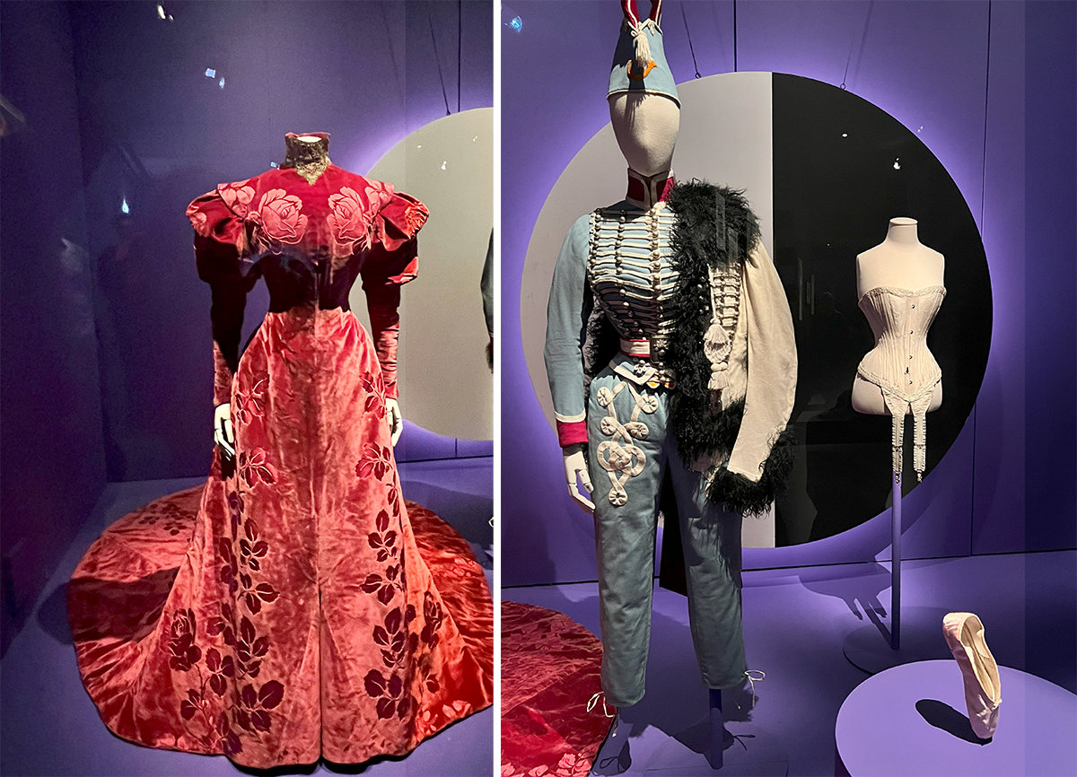 右:ウォルトのドレス。これと比べると、上の3点のドレスのシルエットの新しさが際立つ。 右:1900年ごろにポワレがデザインした『Premiere Empire』の軽騎兵ためのコスチューム。photography: Mariko Omura