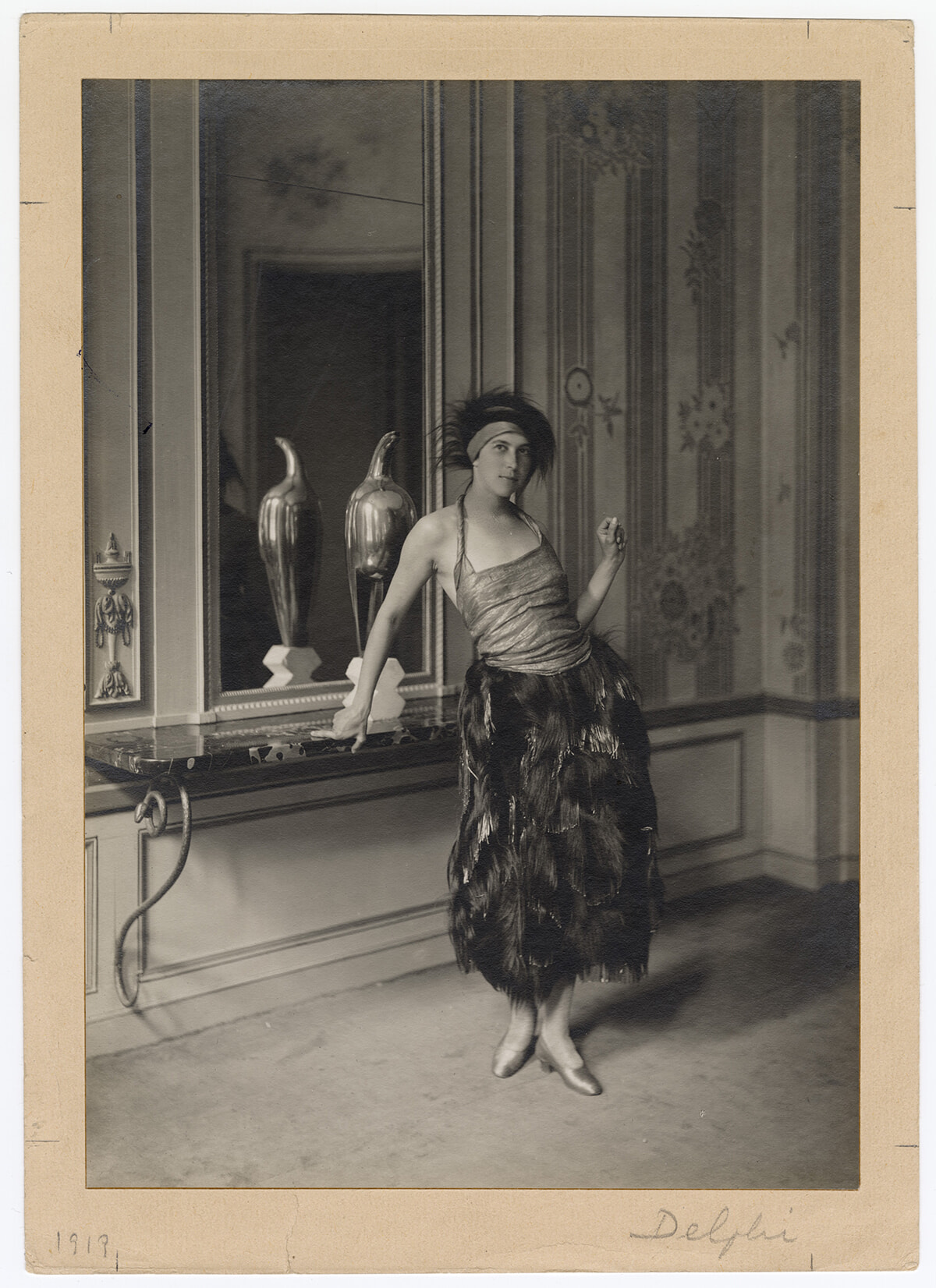 ドレス「神話または牧神」を着てポーズをとる妻のドゥニーズ・ポワレ。後方の彫刻はブランクージ。1919年。© Les Arts Décoratifs