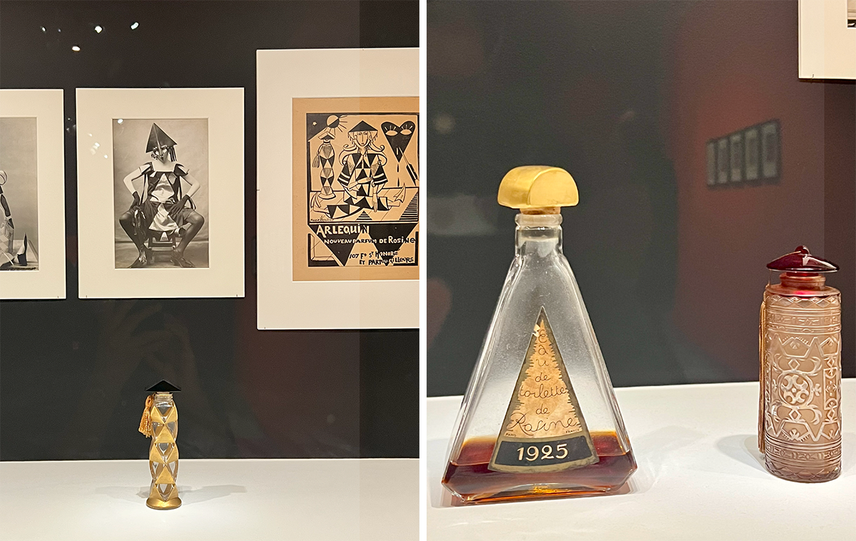 クチュール・メゾンによる香水の先鞭を切ったのがポール・ポワレである。長女の名前をつけたラ・ローズ・ドゥ・ロジーヌを皮切りに、約30種を発表している。会場ではボトルだけでなくプロモーション用の扇やポスターも展示。1923年の香水”レ・パルファン・ドゥ・ロジーヌ –  アルルキナードのために”は、アーティストのマリー・ヴァシリエフがユーモラスなポスターを制作した。