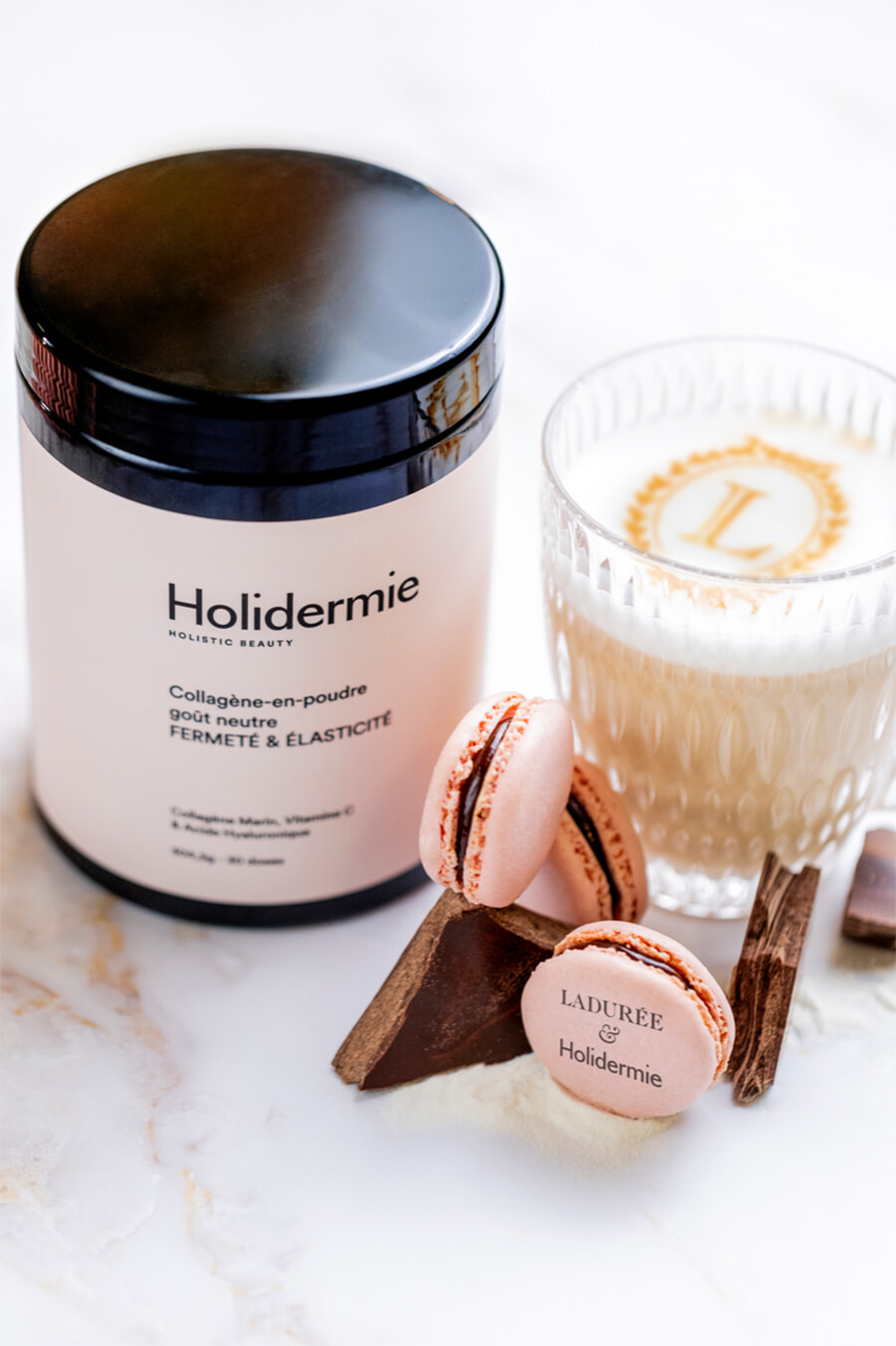 マッチャ・コラーゲン、カフェ・ラテ・バニラ・コラーゲンは各8ユーロ。マカロンの販売はLaduréeのサロン・ド・テとコーヒーショップ、ladurée.frにて。またホリデルミーのブティックおよびデパートのボン・マルシェ(24, rue de Sèvres 75007 Paris)2階のホリデルミーのスタンドでも購入できる。