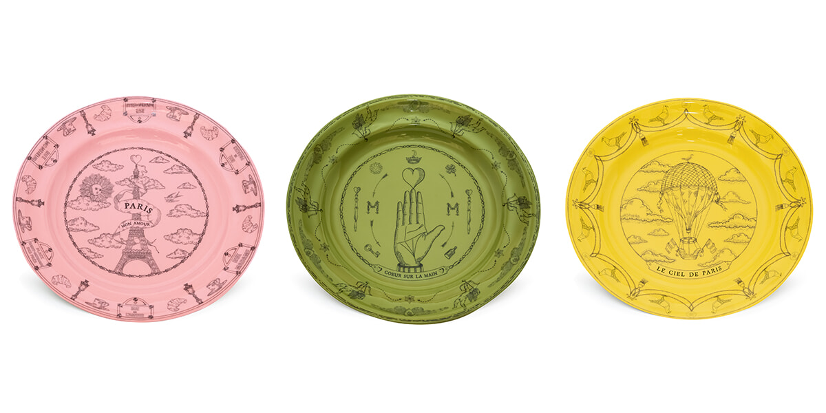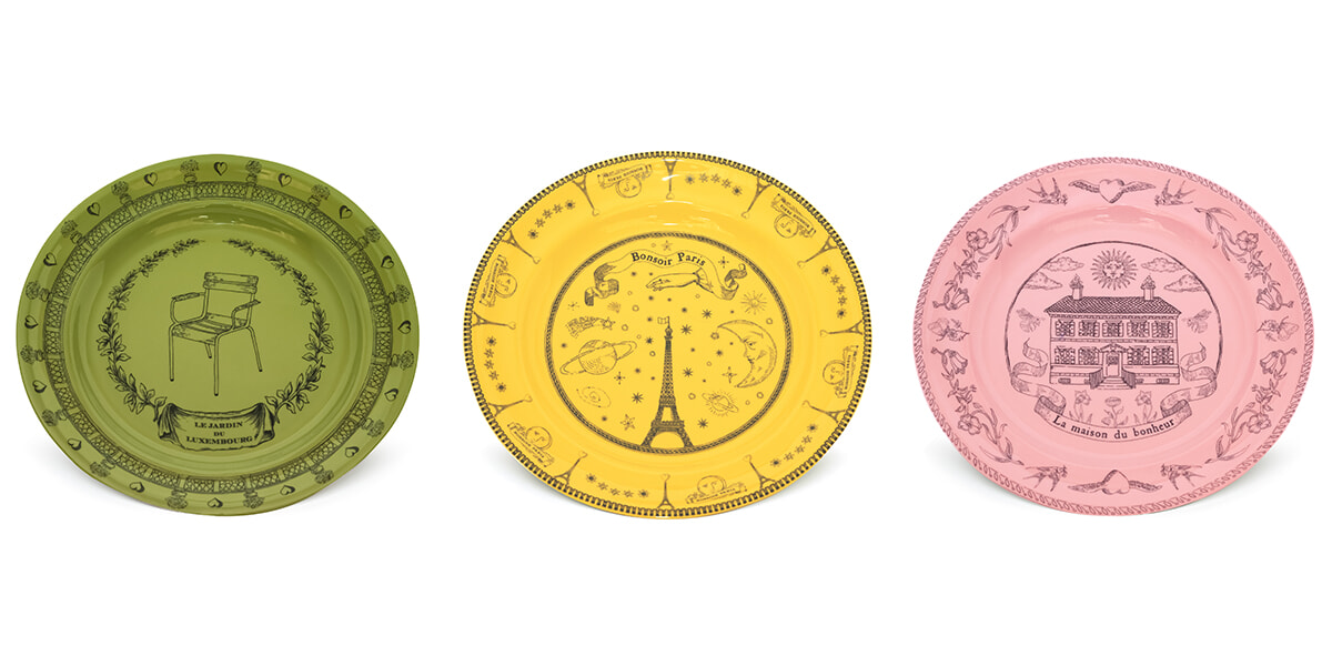 愛しあう二人や風景、あるいは歴史の一コマなど物語が詩的に描かれたモノクロームのトーキング・プレート。蚤の市やブロカントで見かけたことがあるのでは? 19世紀に流行った伝統的なお皿にインスパイアされて、マラン・モンタギュは淡いピンク、明るい黄色、ウッディな緑色の色彩が目に優しいトーキングプレートを発表した。描かれているのはリュクサンブール公園の椅子、エッフェル塔などマランおなじみのモチーフだ。フランスが大切にする職人仕事を生かし、昔ながらの手作り作業によるお皿はとてもチャーミング。