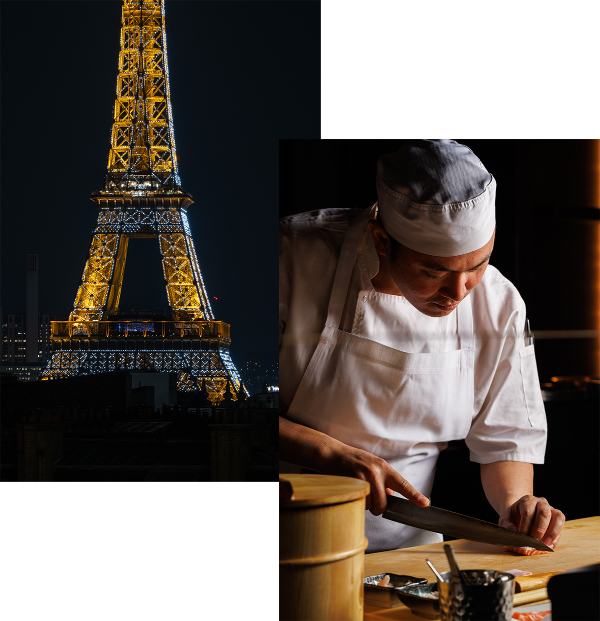 左:レストランからのエッフェル塔の眺め。日没後、毎時5分間のシャンパンフラッシュは眼で味わうご馳走のひとつ。 右:空間の中央に寿司カウンターとバーが設けられ、寿司職人やバーマンたちの仕事を見る楽しみも。