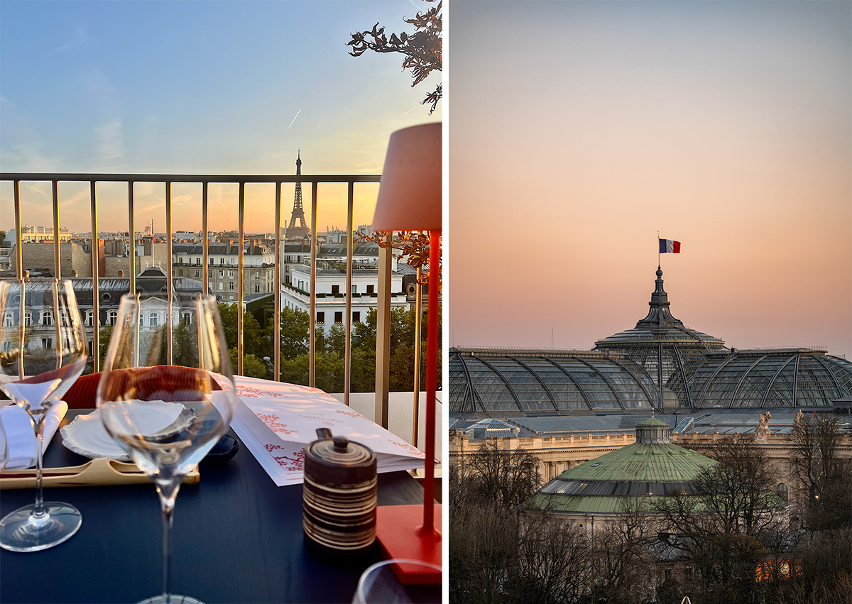 建物の8階に上がると、まずはテラスの正面のエッフェル塔が目に入り、左手には大改装を終えたグラン・パレの姿が。photography: Mariko Omura(左)