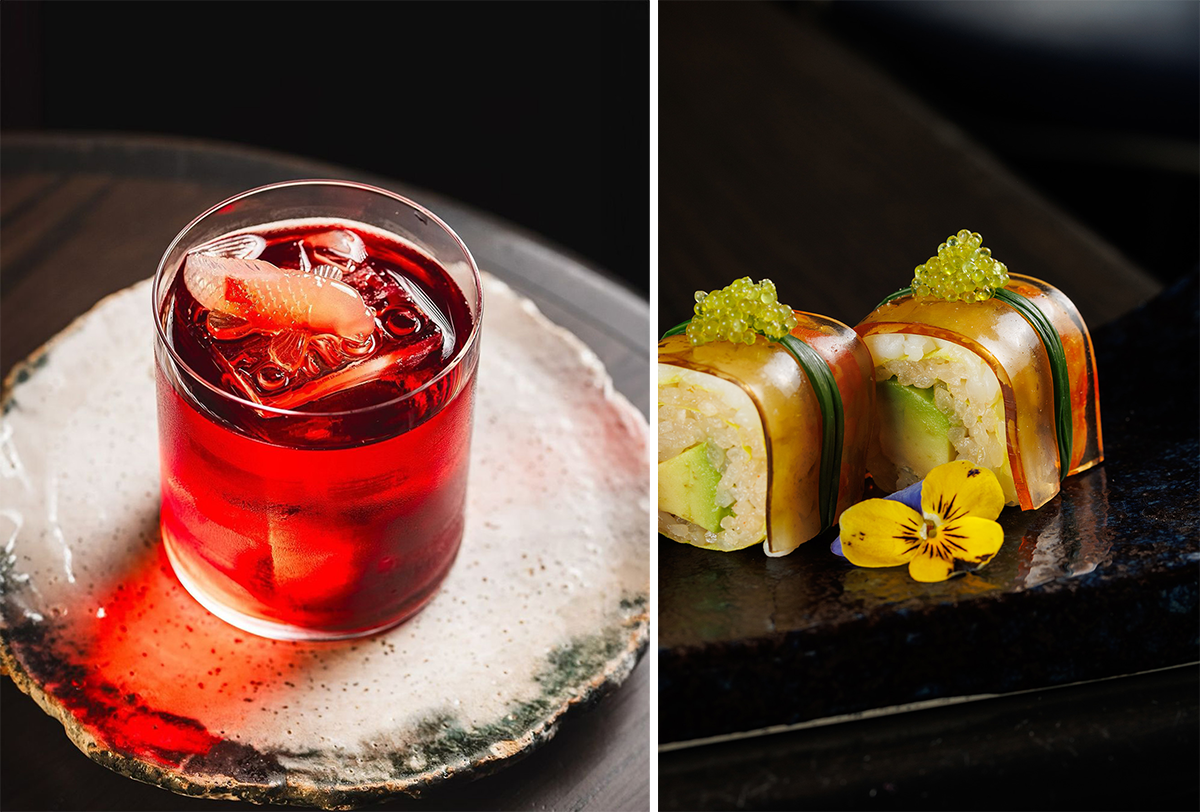 左:いまの時代、 カクテルなしにパリっ子の食事は始まらない! ネグロニの上には魚型のゼリーがちょこんと。 右:シグネシャーの”クリスタル寿司”。帆立貝の寿司にはバラのゼリー、ボタン海老にはポン酢ゼリーというようにクリエイティブな味わいと技の共演が見事。
