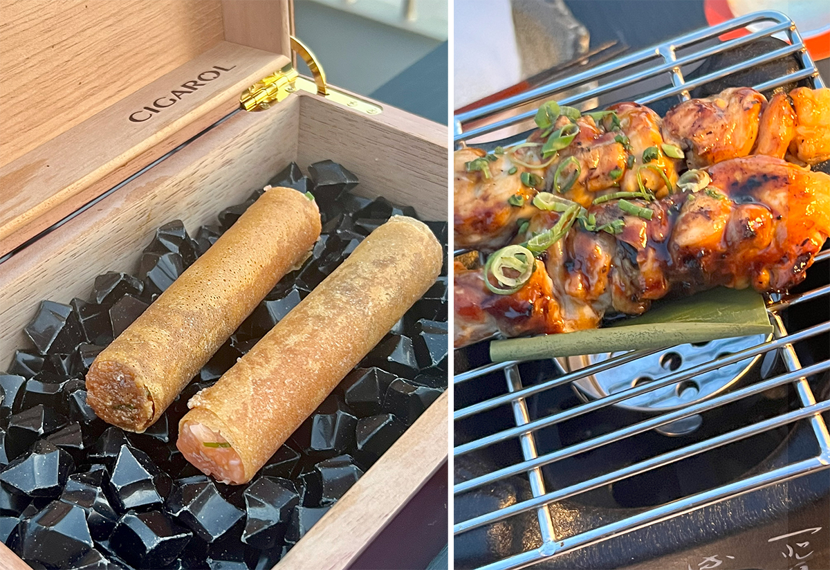 左:葉巻を模したシガロルの2本セット。一本の中身は半分がサーモン、半分がマグロ。 右:トリュフ風味が甘みと絡み合う焼き鳥。photography: Mariko Omura