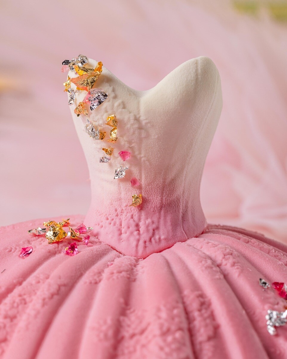 カフェ・ドゥ・ラペのシェフパティシエであるシモン・ルタイユールが提案するのは、オペラ座バレエ団が前シーズンに踊った『眠れる森の美女』の中の”バラのアダージュ”からイメージを得たピンク色のチュチュのケーキ。モデルとなったのは1947年創業のレペットのアーカイブに収められているコスチュームで、まるでおとぎ話の中に登場するパティスリーのように愛らしい。