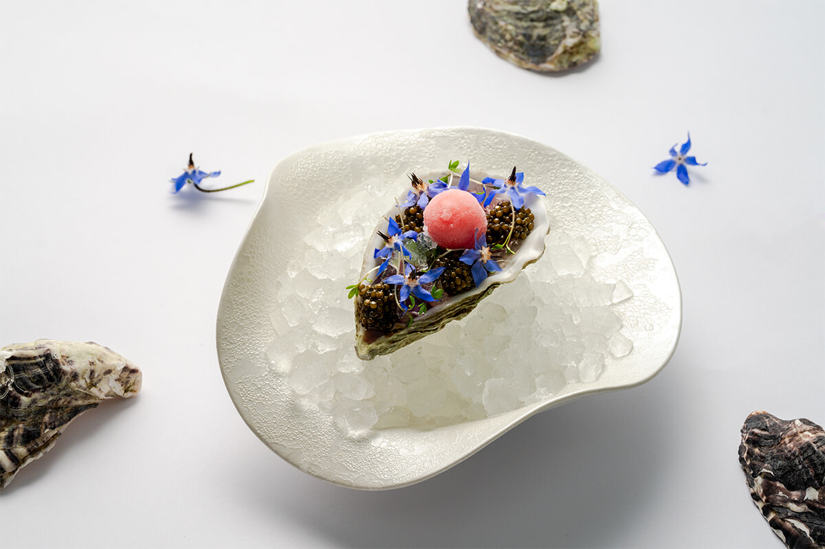 ランチコースは185ユーロから。季節の素材を生かした料理を提供。まろやかさと潮の味のバランスがいい牡蠣を昇華。潮の香りのジュレ、エシャロットのコンフィ、キャビアの塩味、赤ワインビネガーのソルベをアクセントにした「Huître en Gelée d’Eau de Mer」